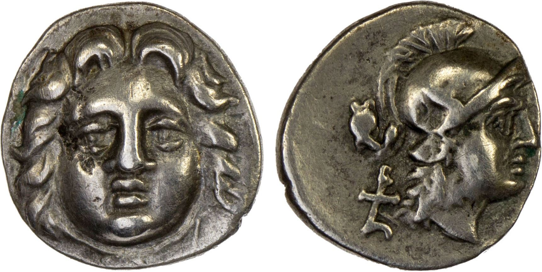 PISIDIA: Selge, AR obol (0.90g), ca. 250-190 BC, SNG Ashmolean 1546-50, gorgoneion facing // helmeted head of Athena right, astragalos above symbol to left, Choice VF.