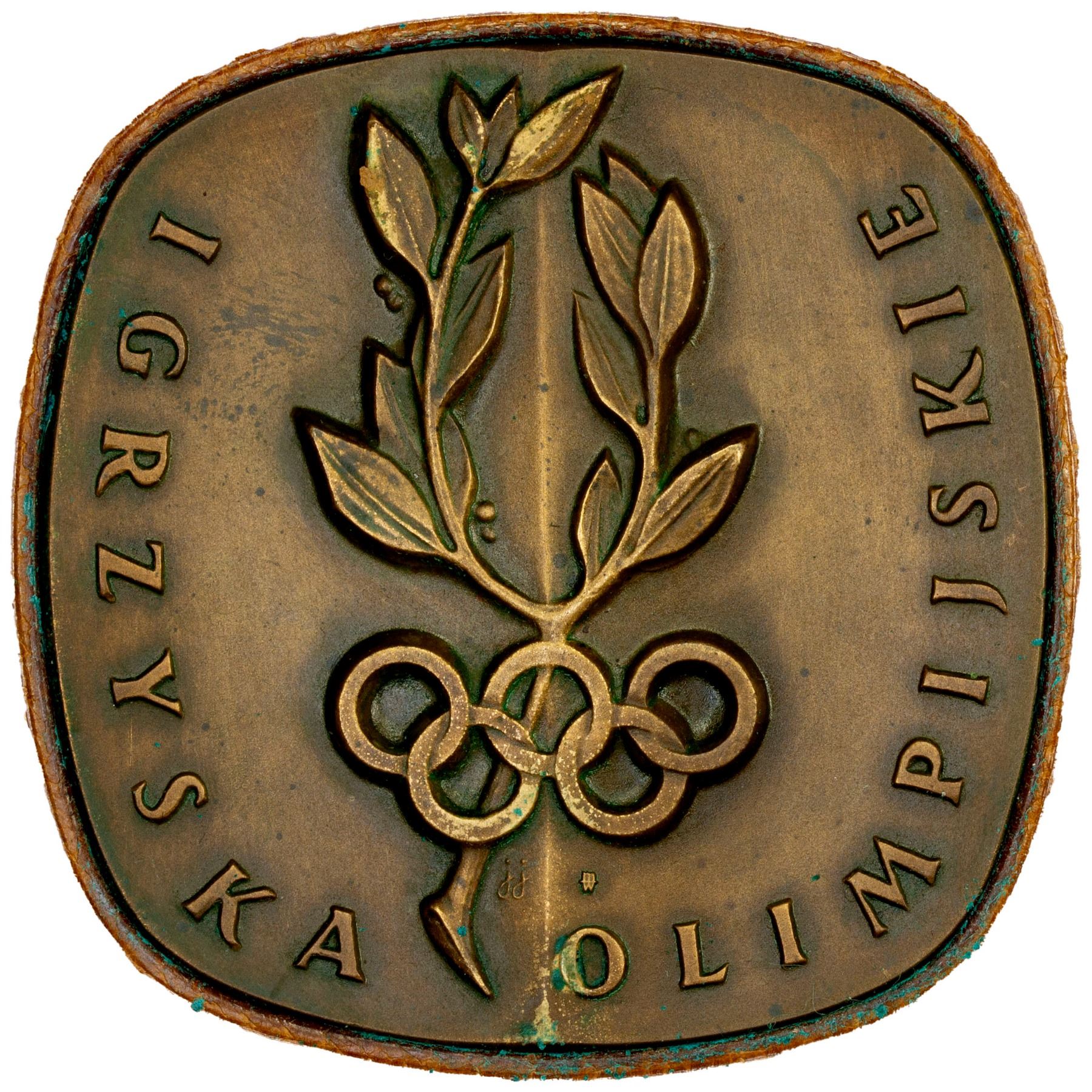 POLAND: AE medal (117.6g), 1972, 56x56mm bronze Participant's Medal for the Polish deligation to the 1972 Summer Olympics in Munich by j.j., Olympic rings with laurel branch behind and IGRZYSKA OLIMPIJSKIE around // outstretched eagle on top of outline map of Poland inscribed POLSKI / FUNDUSZ / OLIMPIJ / SKI with '1972" below, lightly cleaned, in original leather case, Unc.