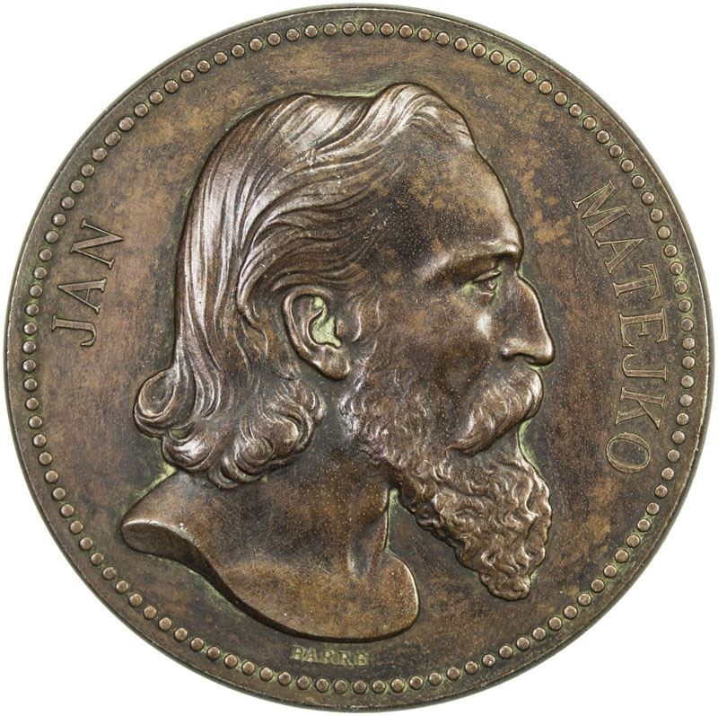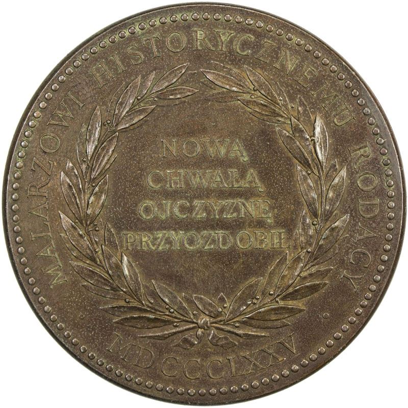 POLAND: Alexander II, 1855-1881, AE medal, 1875, H-Cz. 8104, 55mm, medal by Barré, JAN MATEJKO around bust right / NOWA CHWALA OJCZYZNE PRZYOZDOBIL with laruel wreath, MALARZOWI HISTORYCZNEMU RODACY MDCCCLXXV around, EF, R. Jan Alojzy Matejko (1838-1893) was a Polish painter known for paintings of notable historical Polish political and military events. Albert Désiré Barre (1818-1878) was a French engraver, medalist, and the 18th Chief Engraver of the Paris Mint from 27 February 1855 to his death. Photo size reduced.