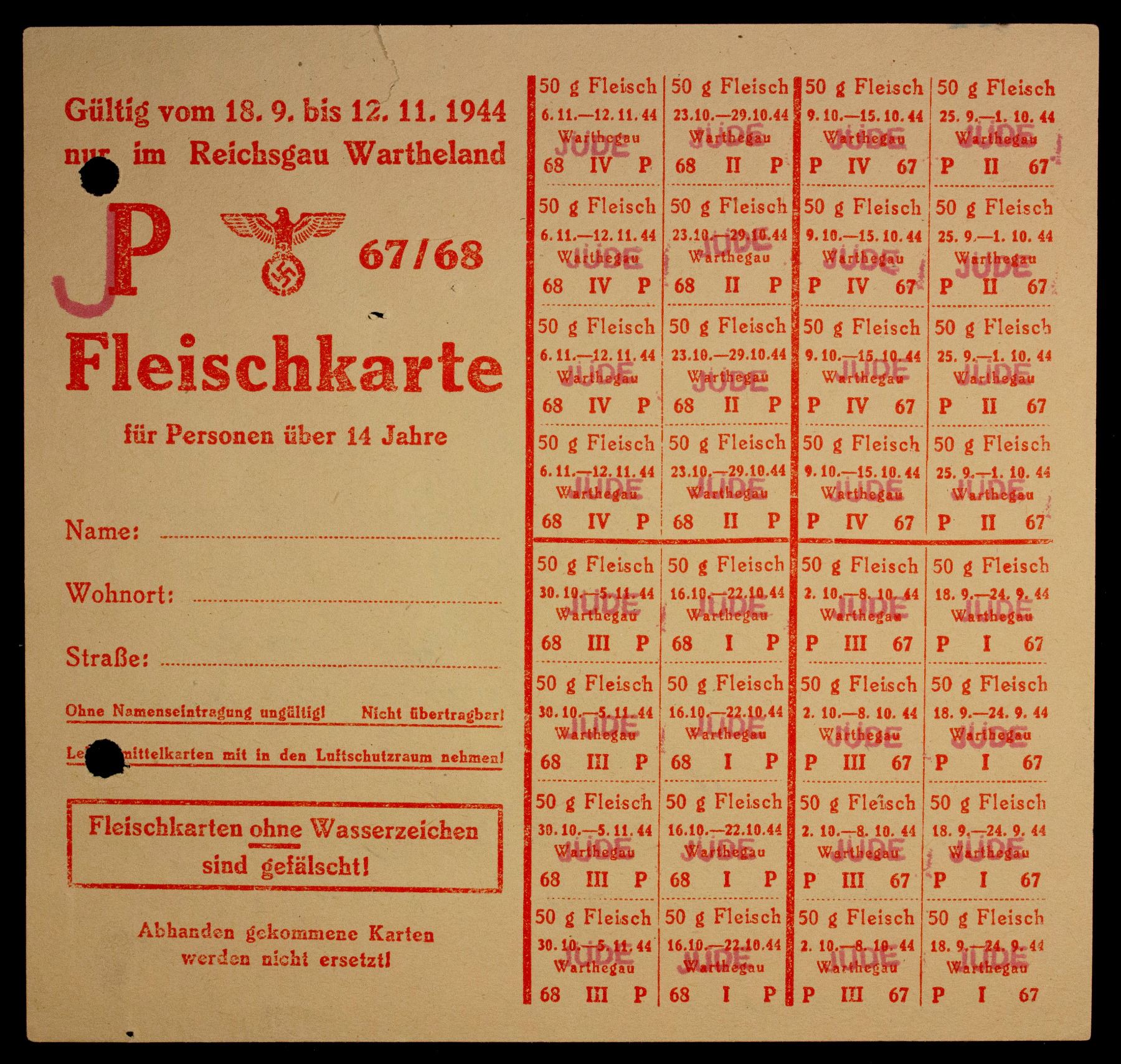 POLAND: German WWII Occupation, meat ration card, 18.9.-12.11.1944, Reichsgau Wartheland issue, orange print with violet "JUDE" (Jew) overprint on each place on grid, two circular holes near left margin and a few small pinholes, slight tear at top, with Polish written text on back, VF, ex Dr. Robert A. Rosenfeld Collection. The Reichsgau Wartheland was a Nazi German Reichsgau formed from parts of Polish territory annexed in 1939 during World War II. It comprised the region of Greater Poland and adjacent areas. Parts of Warthegau matched the similarly named pre-Versailles Treaty Prussian province of Posen. The name was derived from the main river, the river Warta.This item was originally produced by an organization associated with acts of violence, crimes against humanity, war crimes, extremism, human rights violations, or similar topics. Our firm does not endorse such activities and only offers this item as an artifact of history to further research and civil enlightenment.
