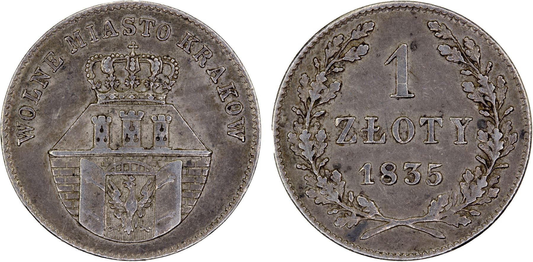 POLAND: KRAKOW: Free City, AR zloty, 1835, Cr-13, once lightly cleaned and re-toned, About XF, ex Dr. Robert A. Rosenfeld Collection.
