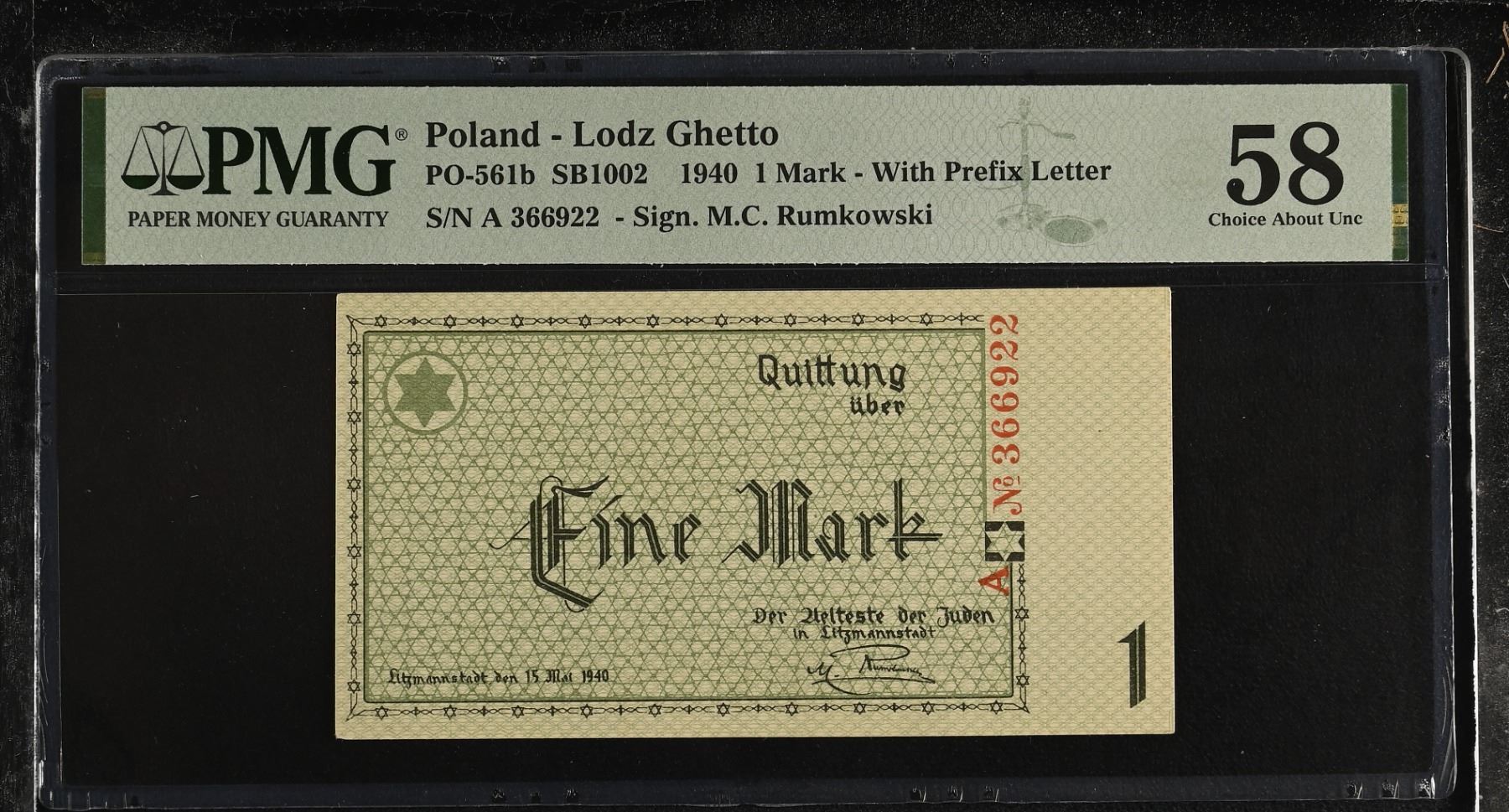 POLAND: LODZ: 1 mark, 15.5.1940, PO-561b, SB-1002, Campbell-4202a, 64x120mm issue for Lodz Ghetto (Litzmannstadt), variety with 6-digit serial number, PMG graded AU58, ex Dr. Robert A. Rosenfeld Collection.