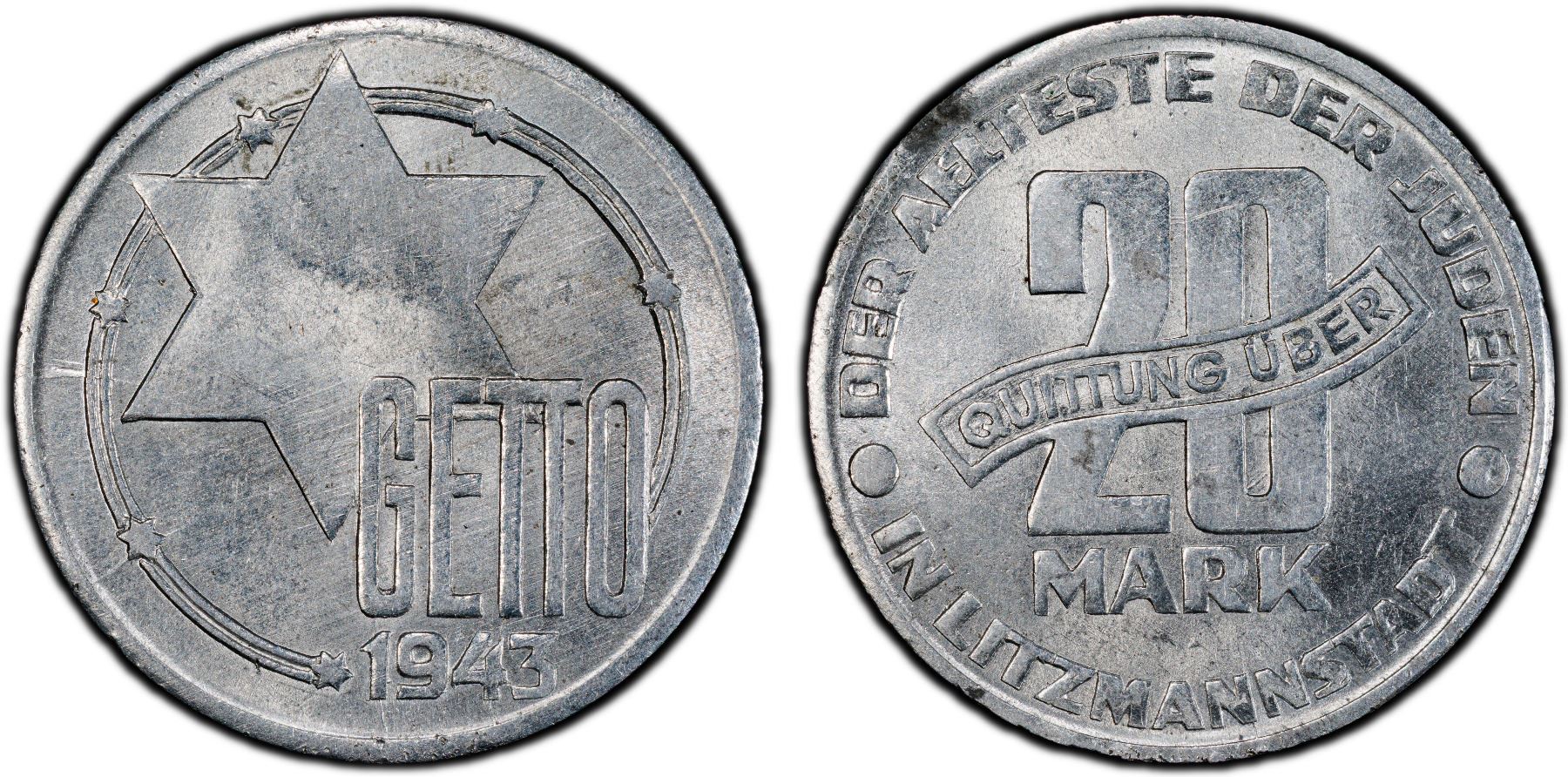 POLAND: Lodz: Litzmannstadt Ghetto, 20 mark, 1943, KM-Tn4, struck in aluminum, a lustrous mint state example! PCGS graded MS63. The Litzmannstadt (Lodz) ghetto was established as an industrial base to manufacture war supplies. The Nazis set up a Jewish council and appointed Mordechai Chaim Rumkowski to keep order. From 1942 to 1943, tokens were struck in the name of the Jewish Elders of Litzmannstadt, the name the Germans chose for the city to honor the German General Karl Litzmann, of WWI fame. These tokens were the only legal currency in the Lodz Ghetto and used to buy what food and medicine they could. Jews traded their personal possessions to acquired these tokens. The 20 mark denomination was the highest issued by the Elders and this is tied with only two other examples for highest graded (Top Pop) at PCGS!