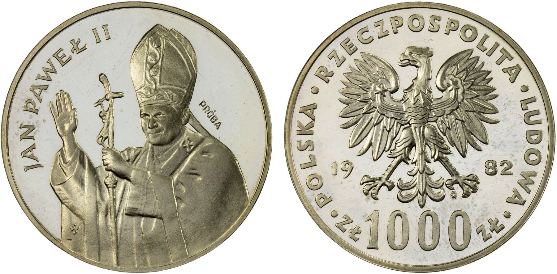 POLAND: People's Republic, AR 1000 zlotych, 1982, KM-Pr478, Pope John Paul II, Proba, a few hairlines, mintage of only 10,000 pieces, Proof, ex Almer H. Orr III Collection.