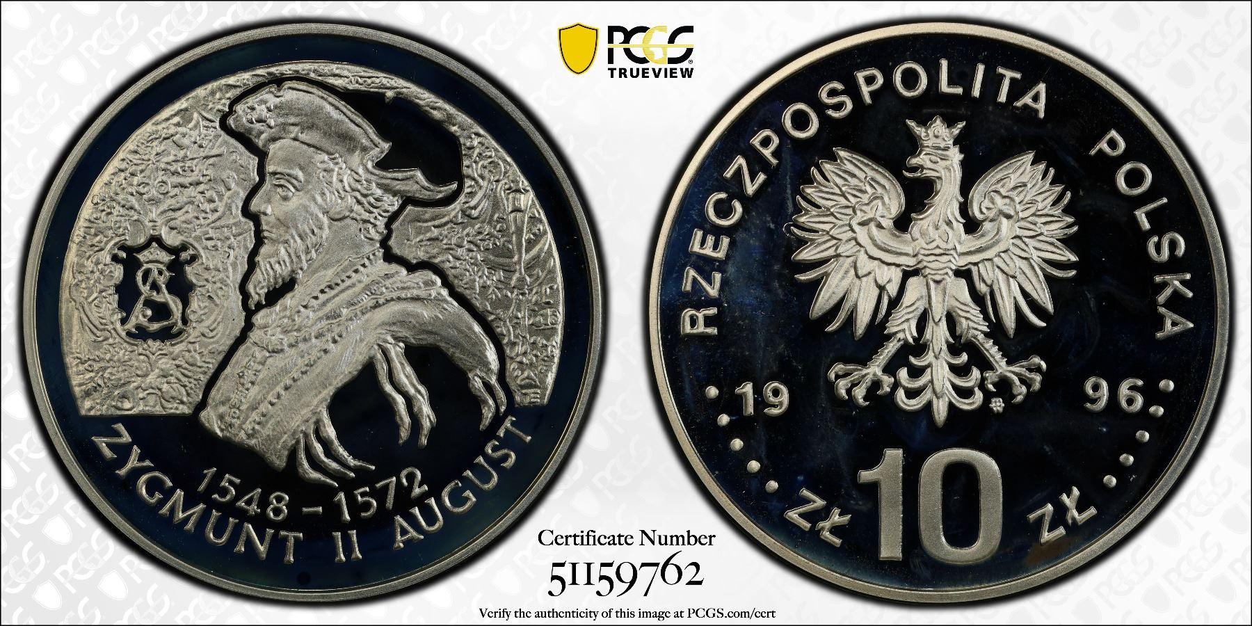 POLAND: Republic, AR 10 zlotych, 1996-MW, Y-307, Zygmunt II August, a spectacular example, PCGS graded PF68 Deep Cameo.