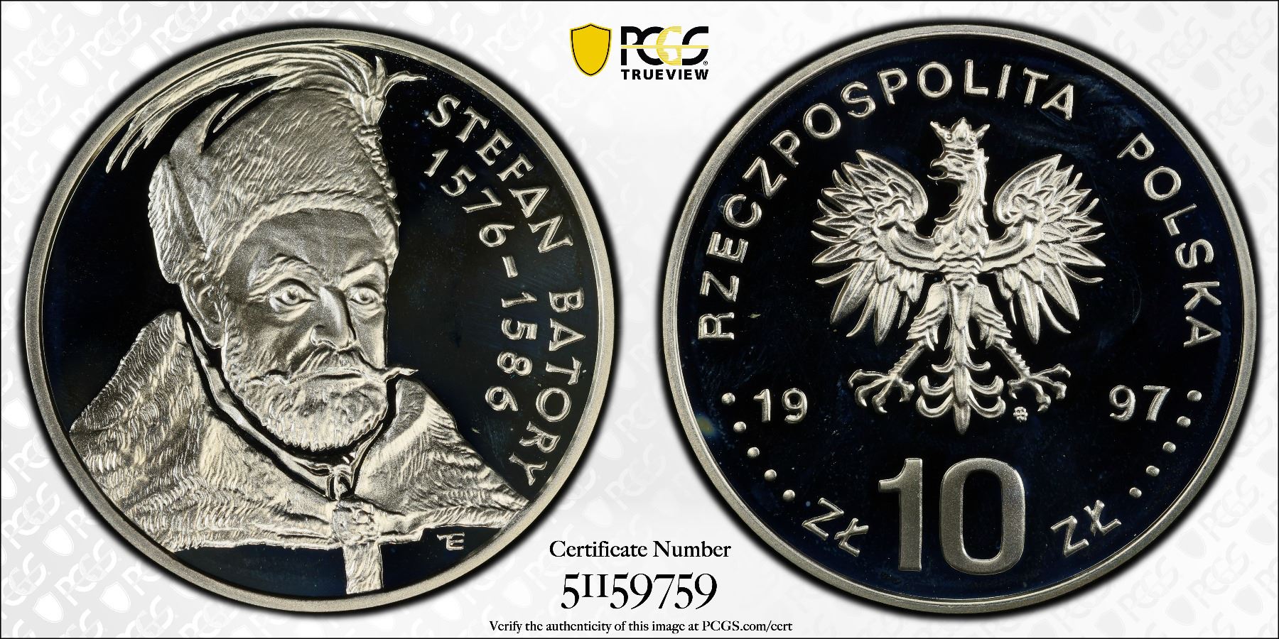 POLAND: Republic, AR 10 zlotych, 1997-MW, Y-327, Stefan Batory, a spectacular example, PCGS graded PF68 Deep Cameo.