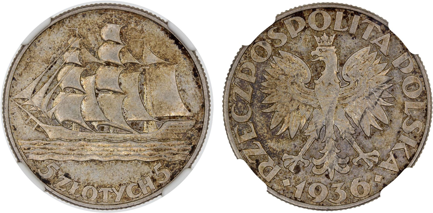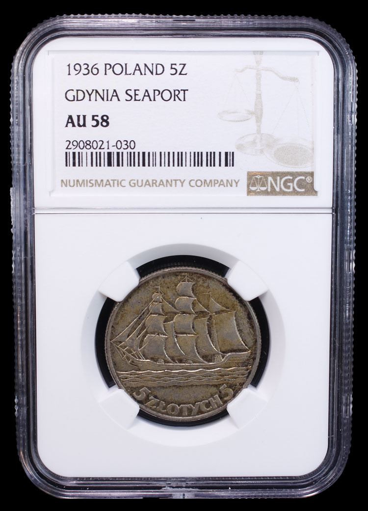 POLAND: Republic, AR 5 zlotych, 1936, Y-31, 15th Anniversary of Gdynia Seaport, sailing ship left, toned, NGC graded AU58.