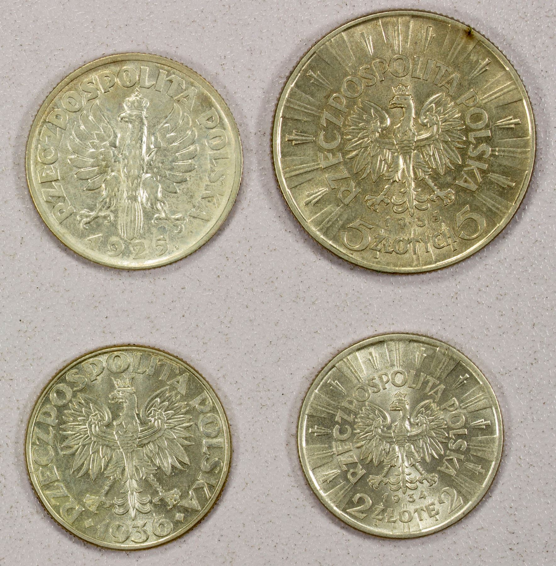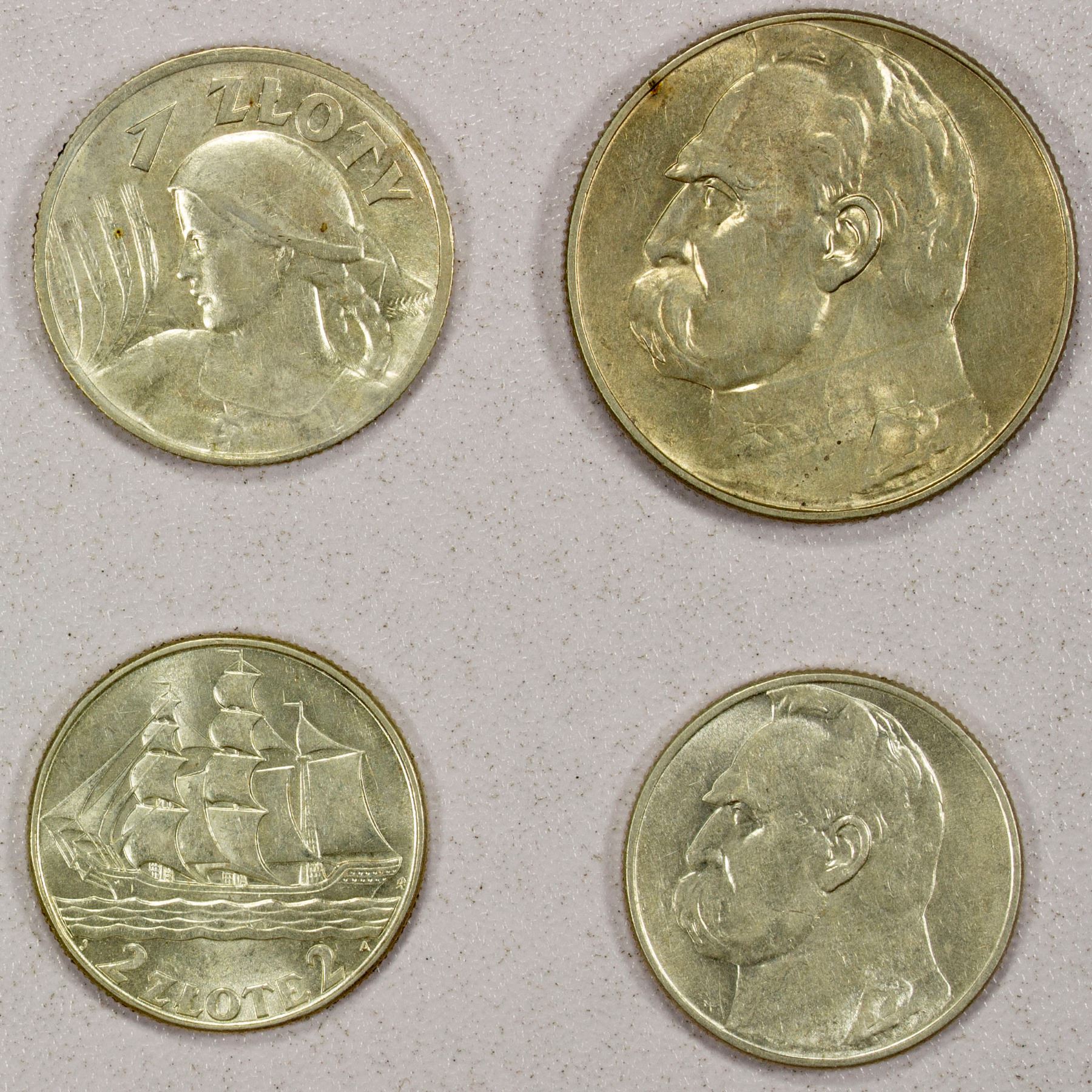 POLAND: Republic, LOT of 4 coins, including 1 zloty (London 1925), 2 zlote (Józef Pilsudski 1934 and Gdynia Seaport 1936), and 5 zlotych 1936, all choice AU; retail value $300, lot of 4 pieces, AU.