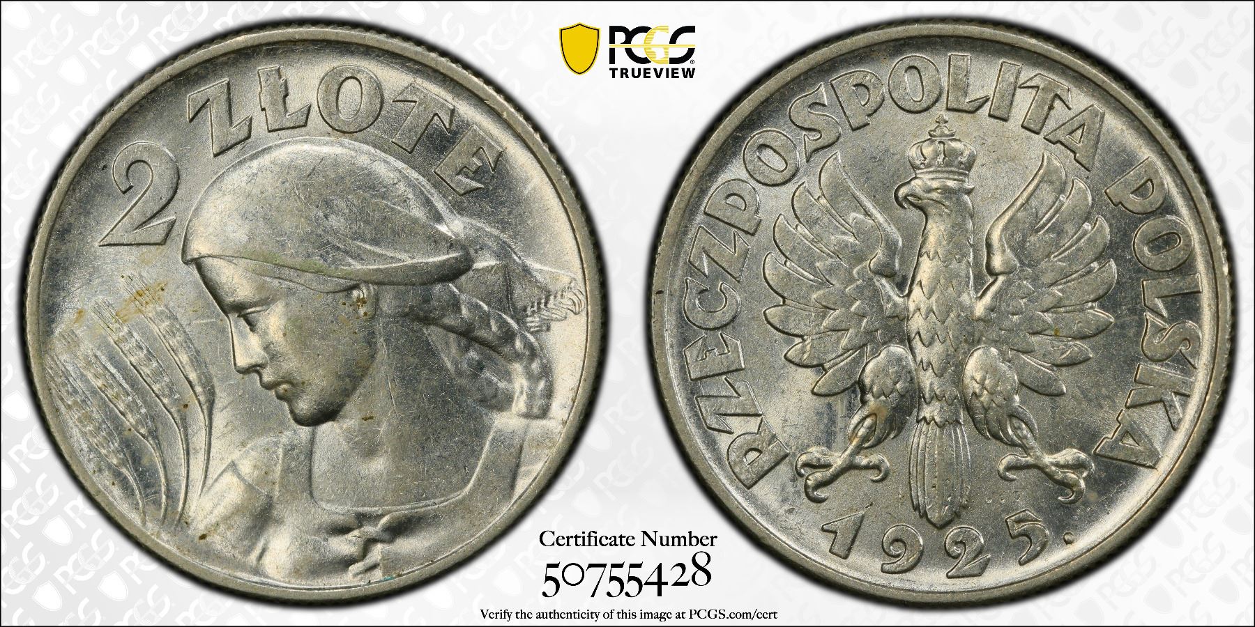 POLAND: Second Republic, AR 2 zlote, London, 1925, Y-16, Woman and Wheat Ears type, dot after date variety, a lustrous well struck near mint state example, PCGS graded AU58.