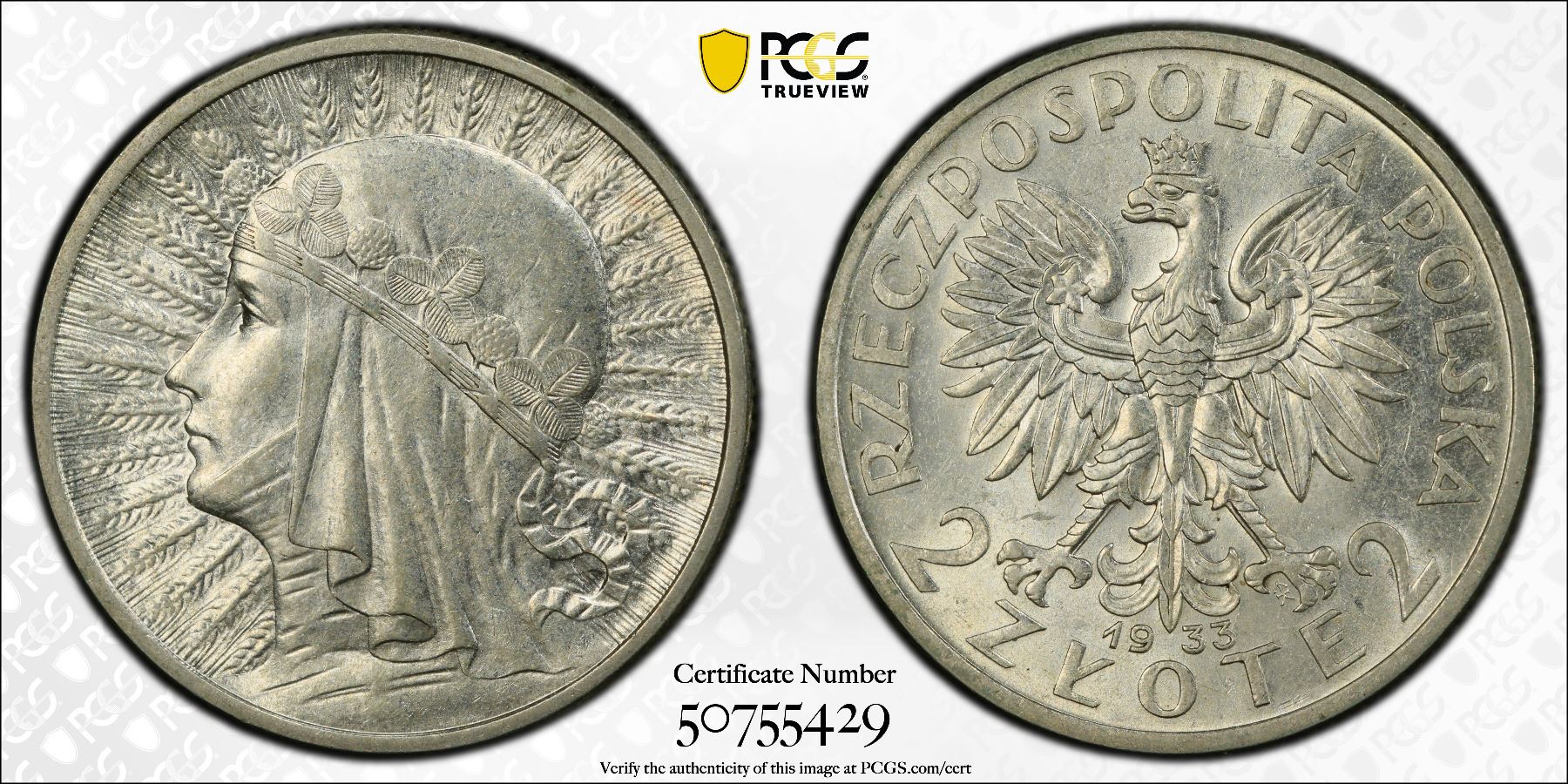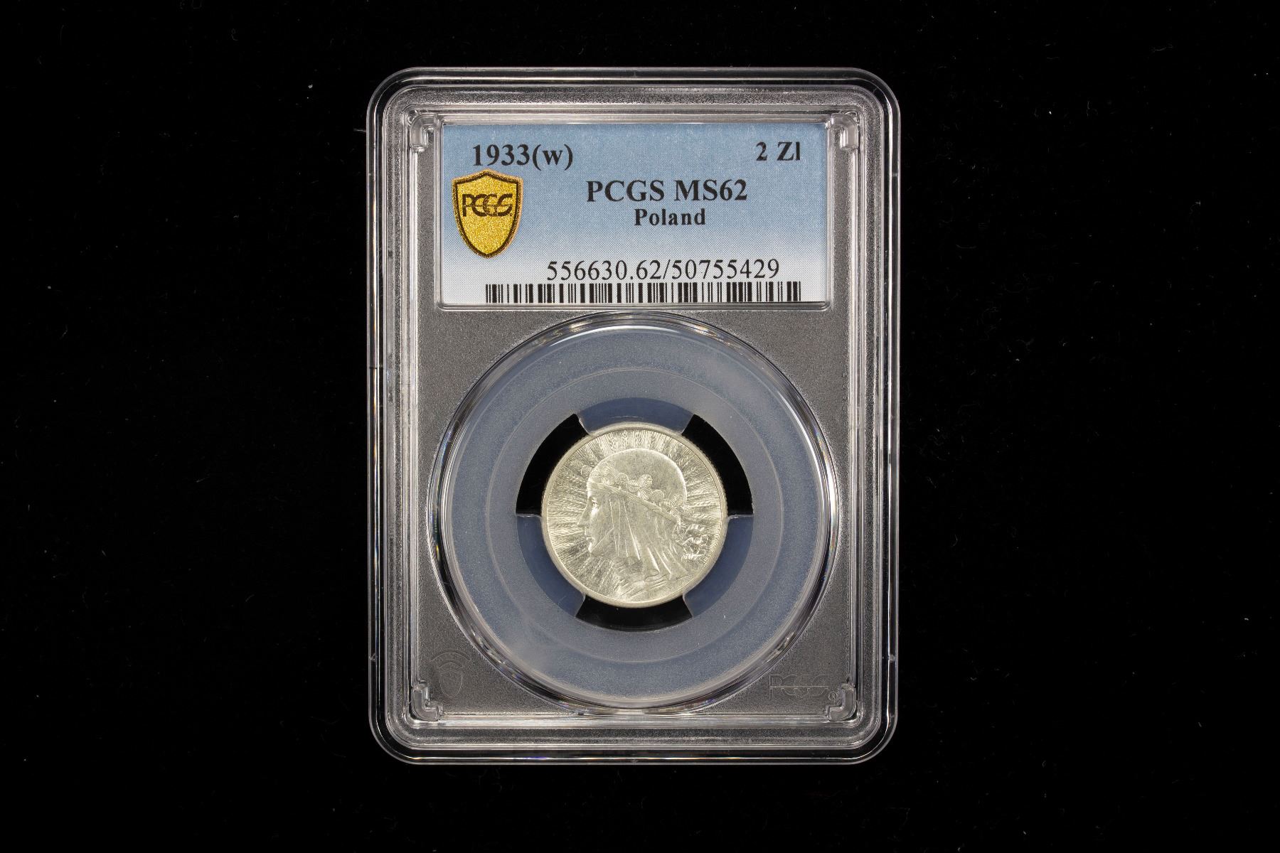 POLAND: Second Republic, AR 2 zlote, Warsaw, 1933, Y-20, Polonia type, a pleasing lustrous mint state example, PCGS graded MS62. "Polonia" refers to the Polish diaspora or people of Polish descent living outside of Poland, and is the name for Poland in Latin. The artist (Antoni Madeyski), designed an idealized image of the Polish community and was inspired by Janina Zóltowska's facial features. For him, she represented perfect beauty reminding him of Queen Jadwiga. As a result many people erroneously attribute this image to the Polish Queen.