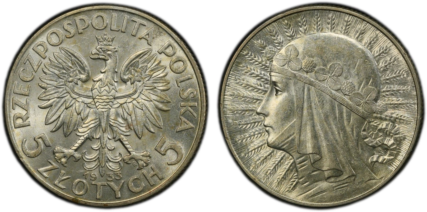 POLAND: Second Republic, AR 5 zlotych, 1933, Y-21, Queen Jadwiga, a pleasing lustrous mint state example, PCGS graded MS62. The artist (Antoni Madeyski), designed an idealized image of the Polish community and was inspired by Janina Zóltowska's facial features. For him, she represented perfect beauty reminding him of Queen Jadwiga. As a result many people erroneously attribute this image to the Polish Queen.