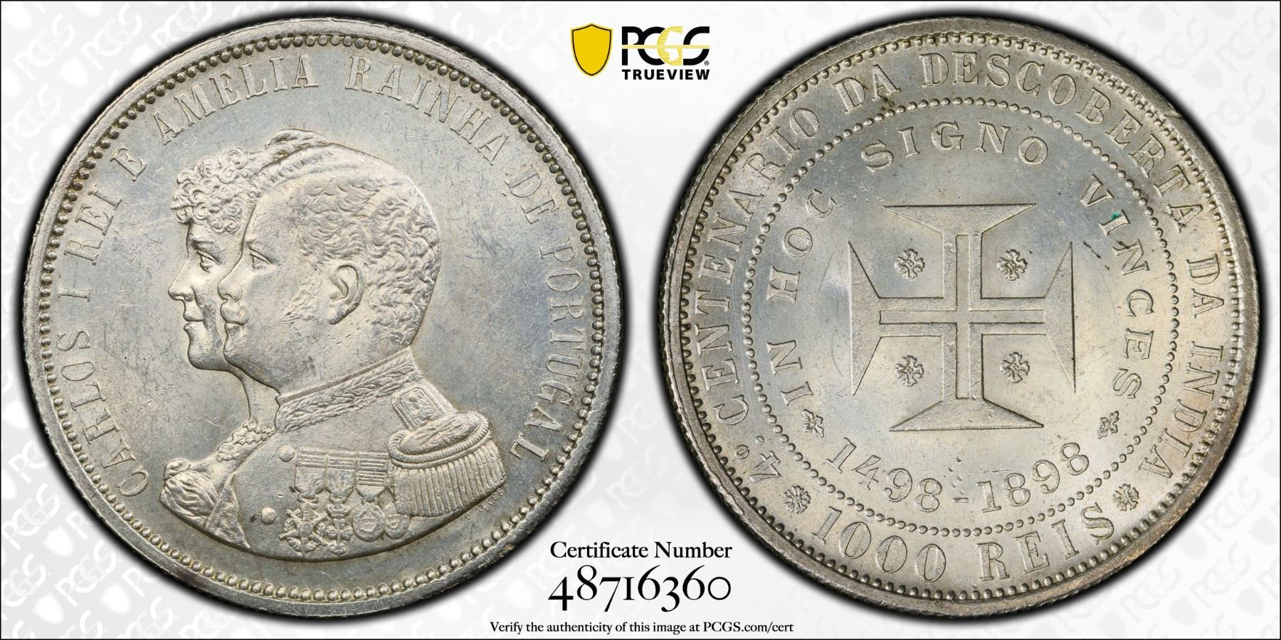 PORTUGAL: Carlos I, 1889-1908, AR 1000 reis, 1898, KM-539, 400th Anniversary of the Discovery of India, very lightly cleaned, but still lustrous, PCGS graded UNC details, ex Almer H. Orr III Collection.