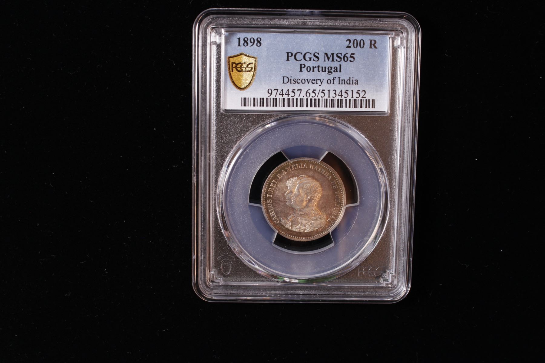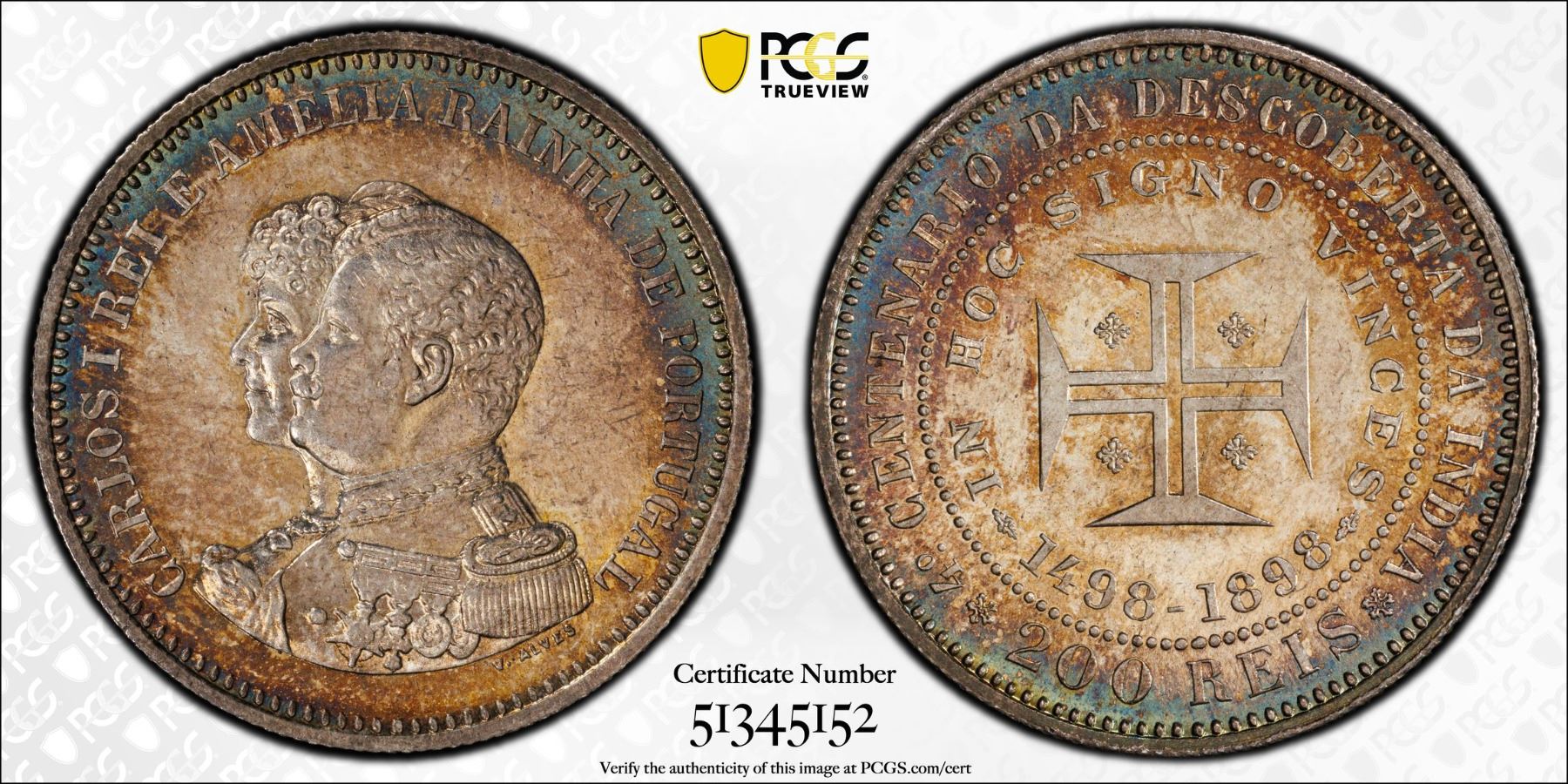 PORTUGAL: Carlos I, 1889-1908, AR 200 reis, 1898, KM-537, 400th Anniversary of the Discovery of India, PCGS graded MS65.