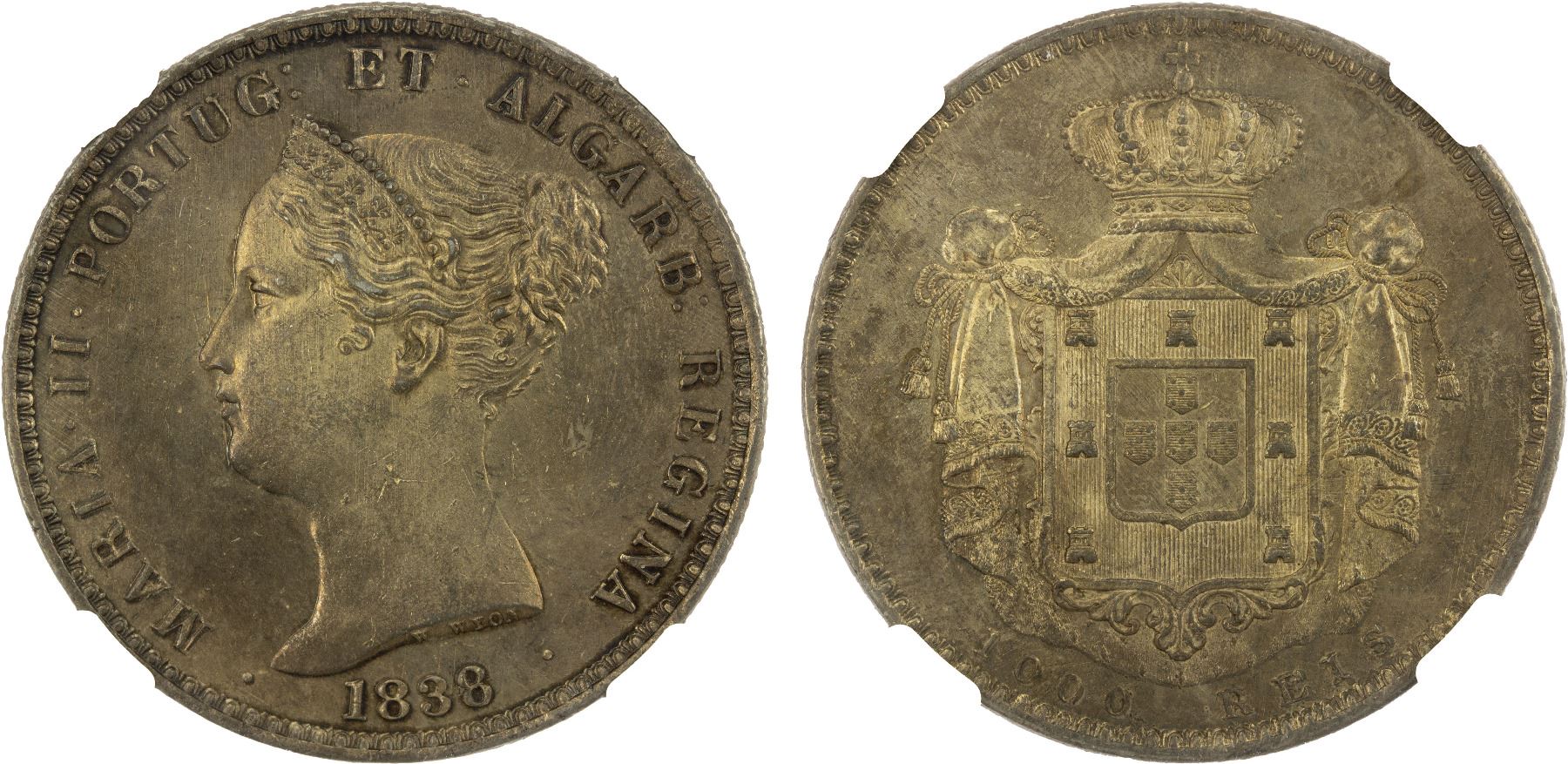 PORTUGAL: Maria II, 1834-1853, AR 1000 reis, 1838/6, KM-472, better date, a pleasing toned mint state example, NGC graded MS62.