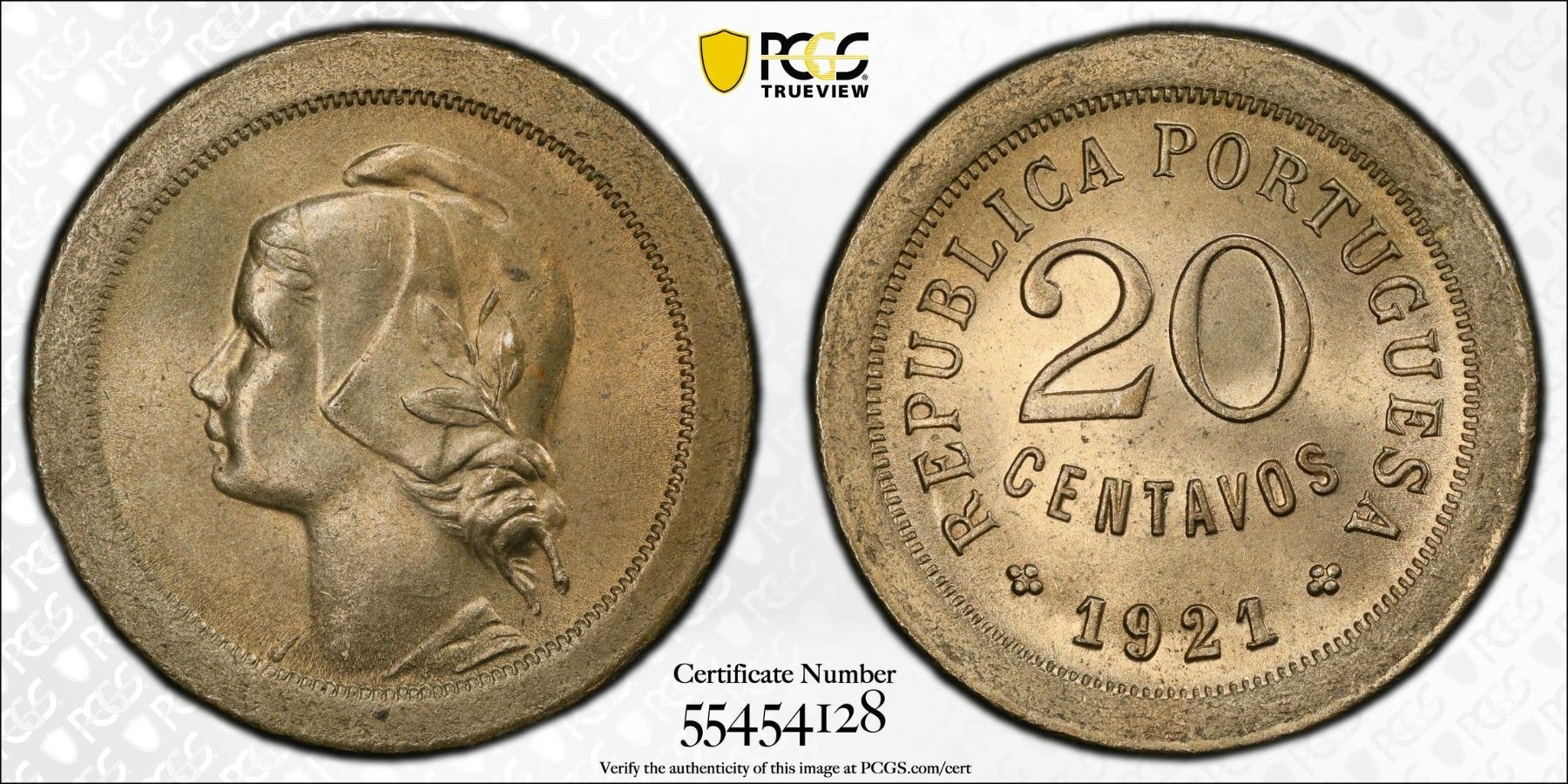 PORTUGAL: Republic, 20 centavos, 1921, PCGS MS65