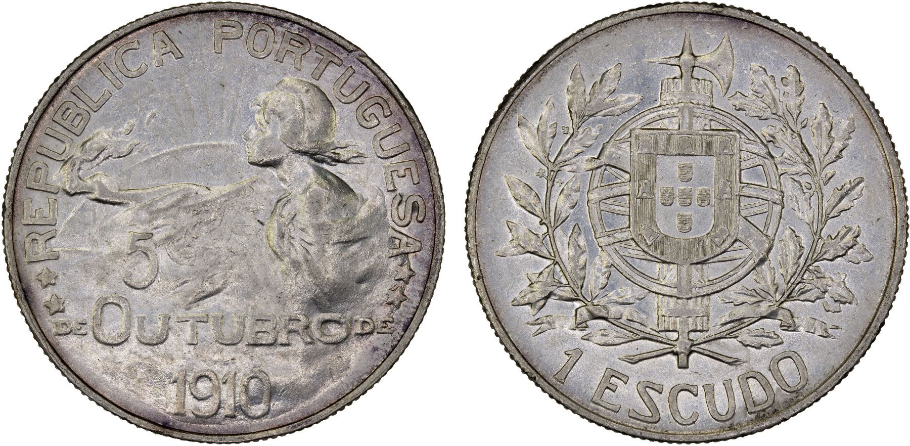 PORTUGAL: Republic, AR escudo, 1910, KM-560, Birth of the Republic, lightly cleaned, XF.