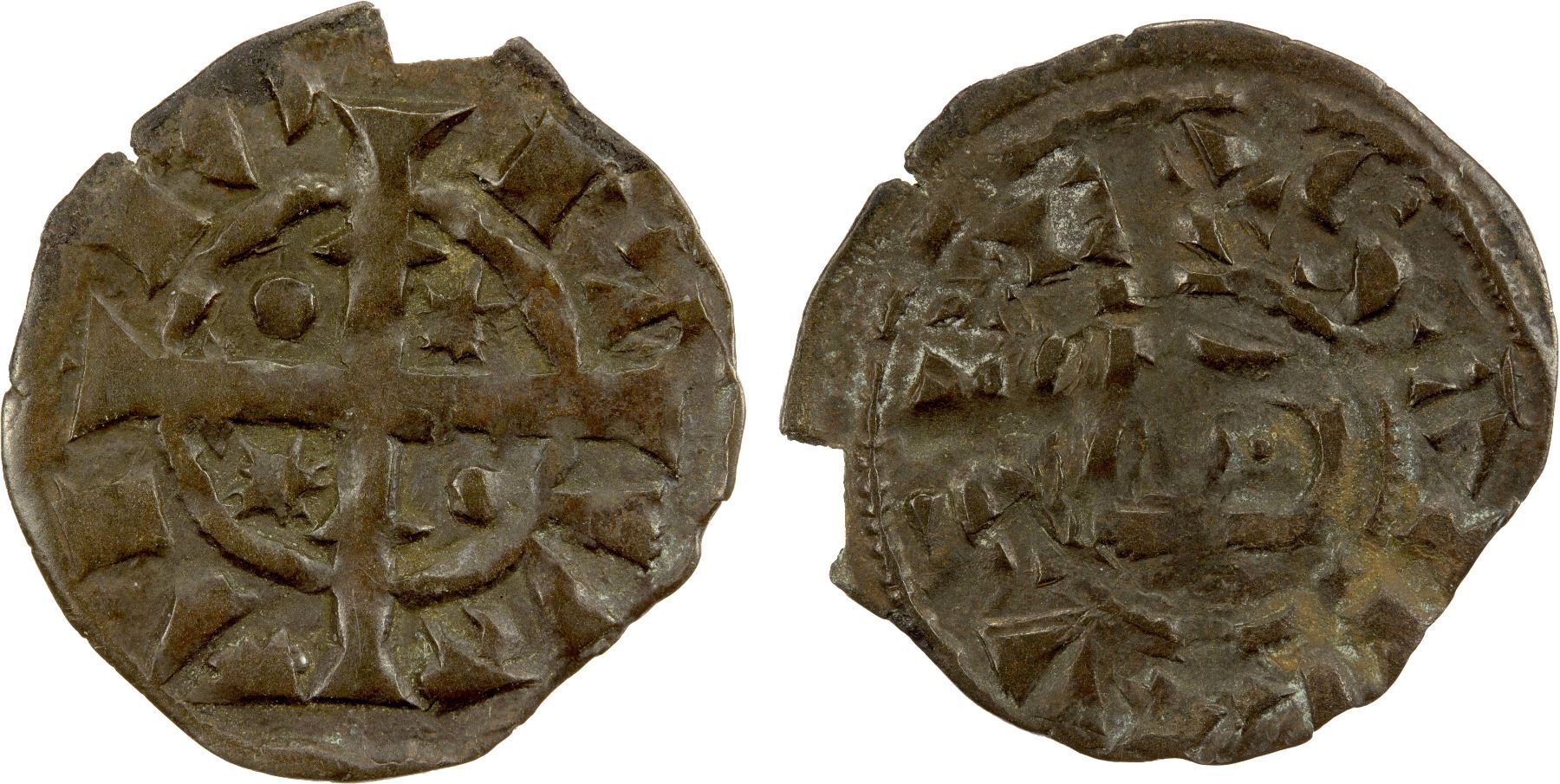 PORTUGAL: Sancho II, 1223-1248, BI dinheiro (0.55g), ND, Gomes-S2.13.02, Vaz-12, obverse legend rather barbarous from ghosting, small edge chip, REX SANCIVS // PO RT VG AL, VF, ex Joe Sedillot Collection.