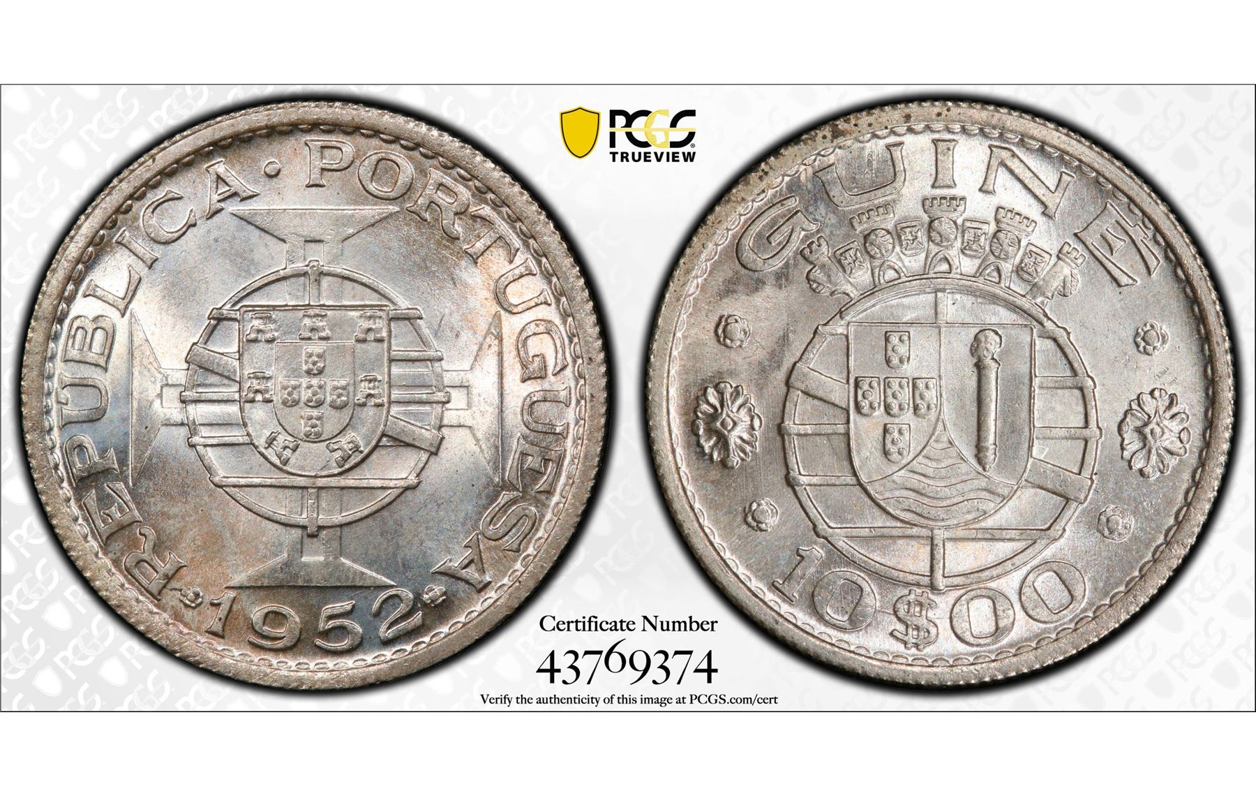 PORTUGUESE GUINEA: AR 10 escudos, 1952, KM-10, a fantastic mint state example! PCGS graded MS66, ex Joe Sedillot Collection.