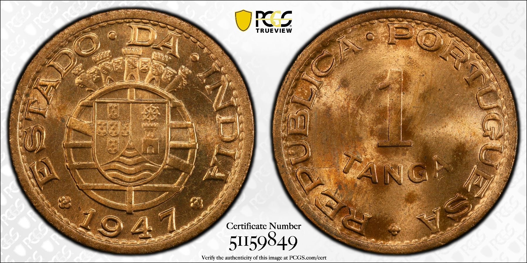 PORTUGUESE INDIA: AE tanga, 1947, KM-24, a wonderful example, PCGS graded MS64 RD.