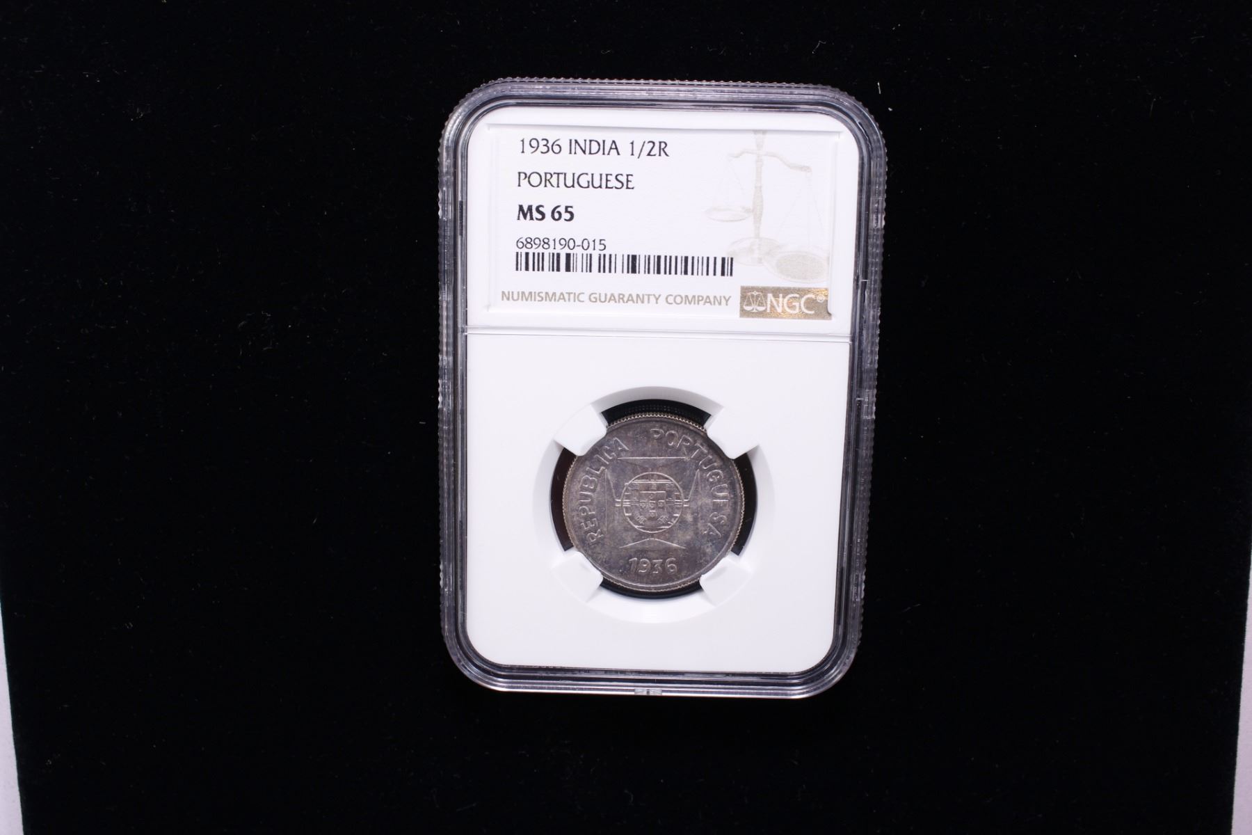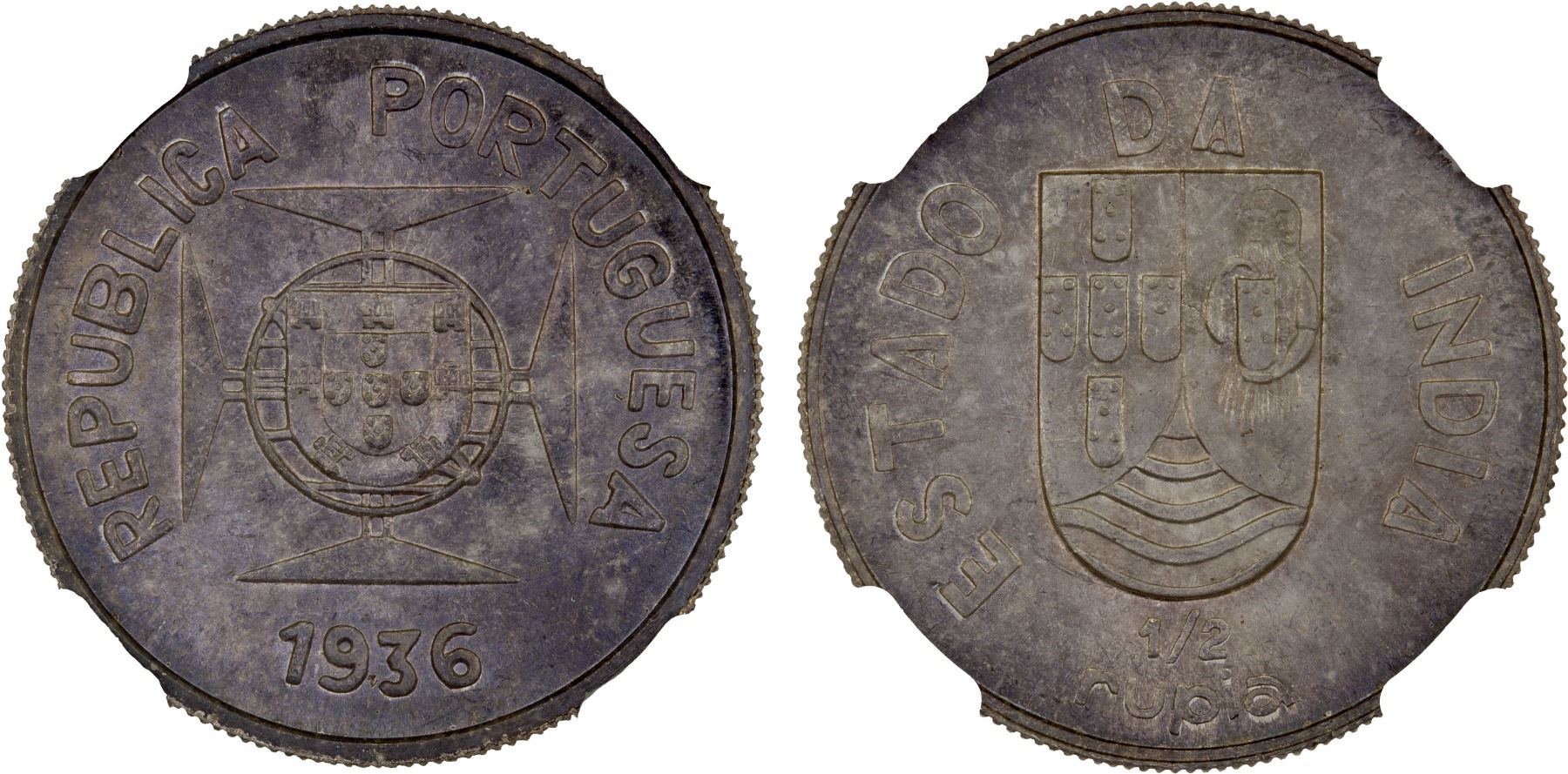 PORTUGUESE INDIA: AR 1/2 rupia, 1936, KM-23, one-year type, a superb toned mint state example! NGC graded MS65.