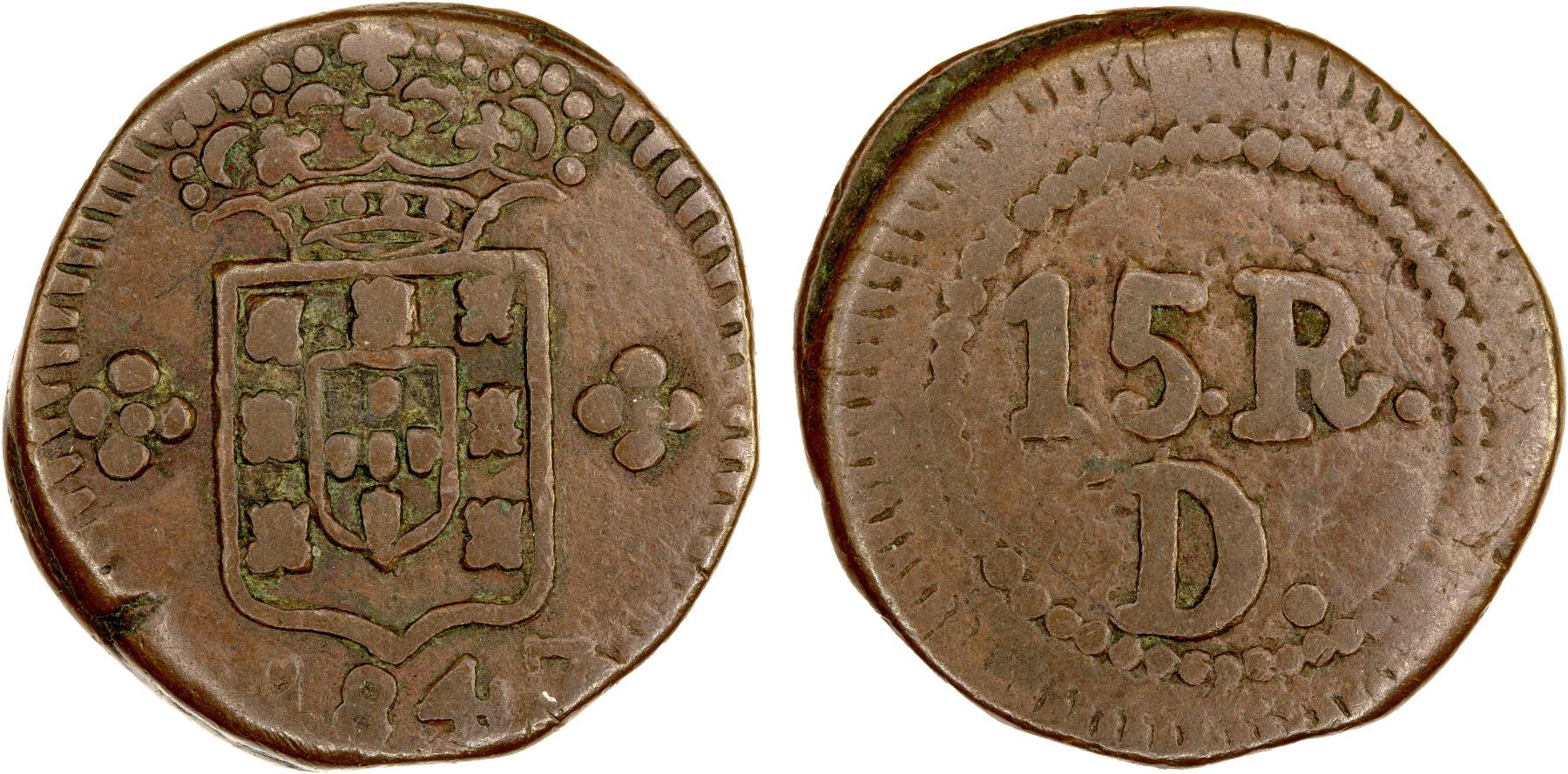 PORTUGUESE INDIA: DAMAO: AE 15 reis (8.59g), 1843, KM-25, Cr-21, Vaz-M2.69, crude, but nice for these, about Fine.