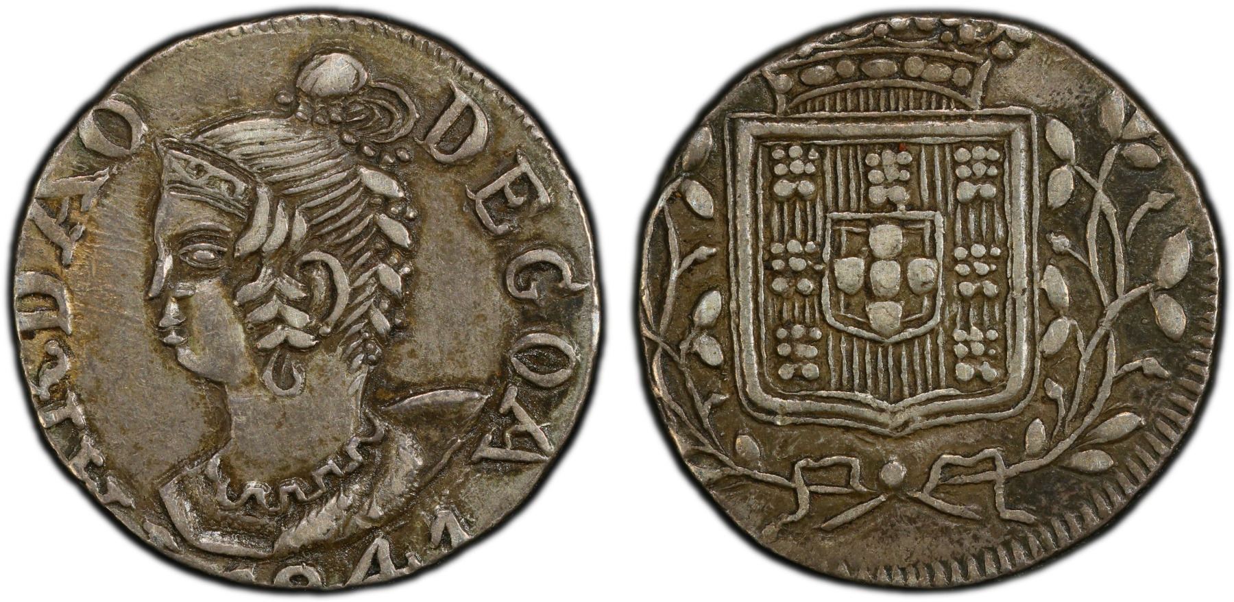 GOA: Maria II, 1834-1853, AR pardau (5.38g), 1841, KM-268, superb bold strike, PCGS graded AU55. The sole highest graded example (Top Pop) at PCGS.