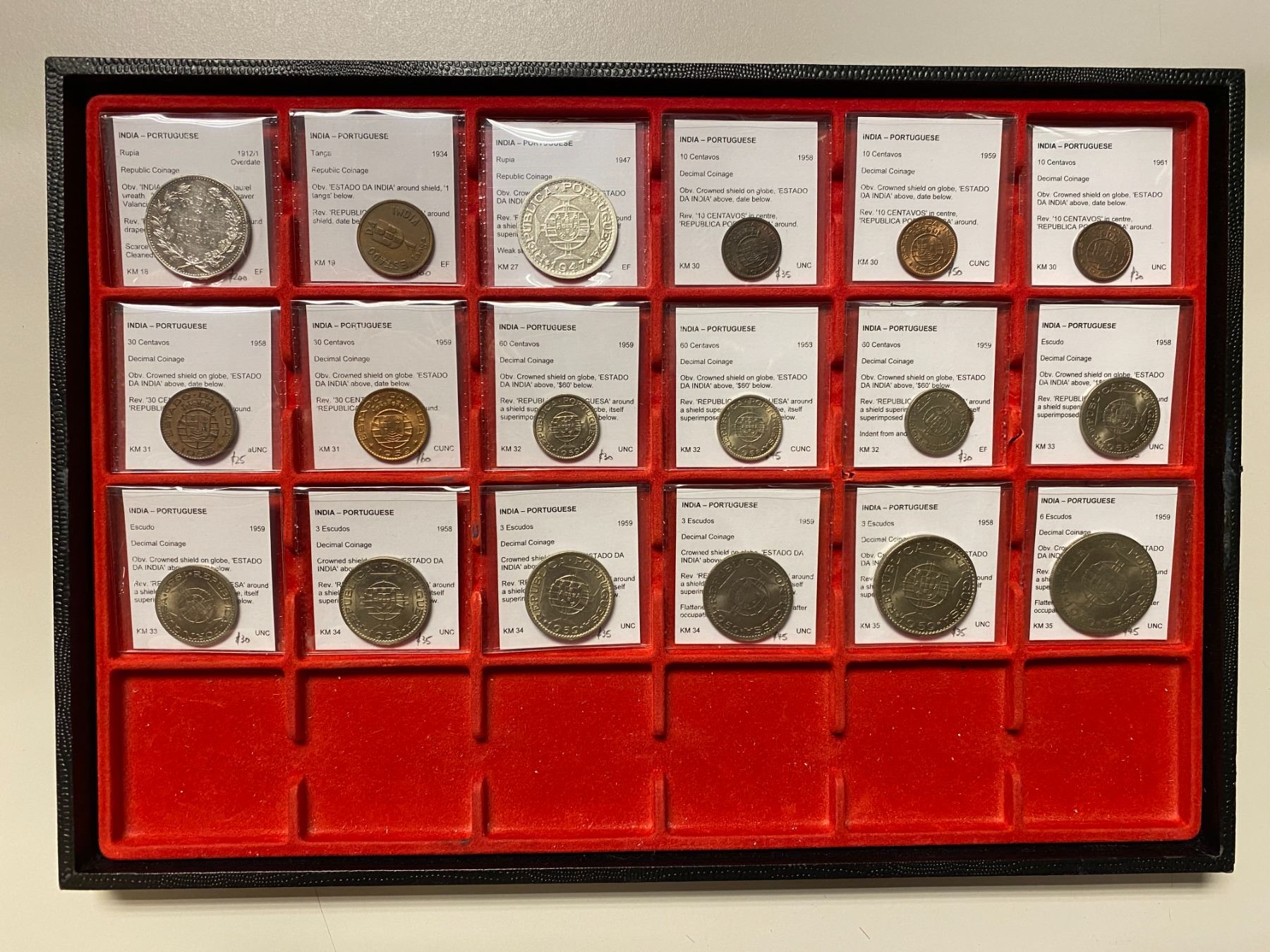 PORTUGUESE INDIA: LOT of 2 silver and 17 base metal coins, Repblic Coinage: KM-18 (AR rupia 1912, with 2 over 1), KM-19 (tanga 1934), and KM-27 (AR rupia, 1947), all EF condition; and Decimal Coinage: KM-30 (10 centavos 1958, 1959, 1961), KM-31 (30 centavos 1958, 1959), KM-32 (60 centavos 1958 and 2 varieties of 1959), KM-33 (escudo 1958, 1959, KM-34 (3 escudos 1958 and two examples of 1959), and KM-35 (6 escudos 1958 and two examples of 1959), mostly Unc; the second examples of types KM33 and KM34 have been flattened for removal from circulation after Portuguese India was transfered to the Republic of India; with Ian Todd's description; retail value $300, lot of 19 pieces.