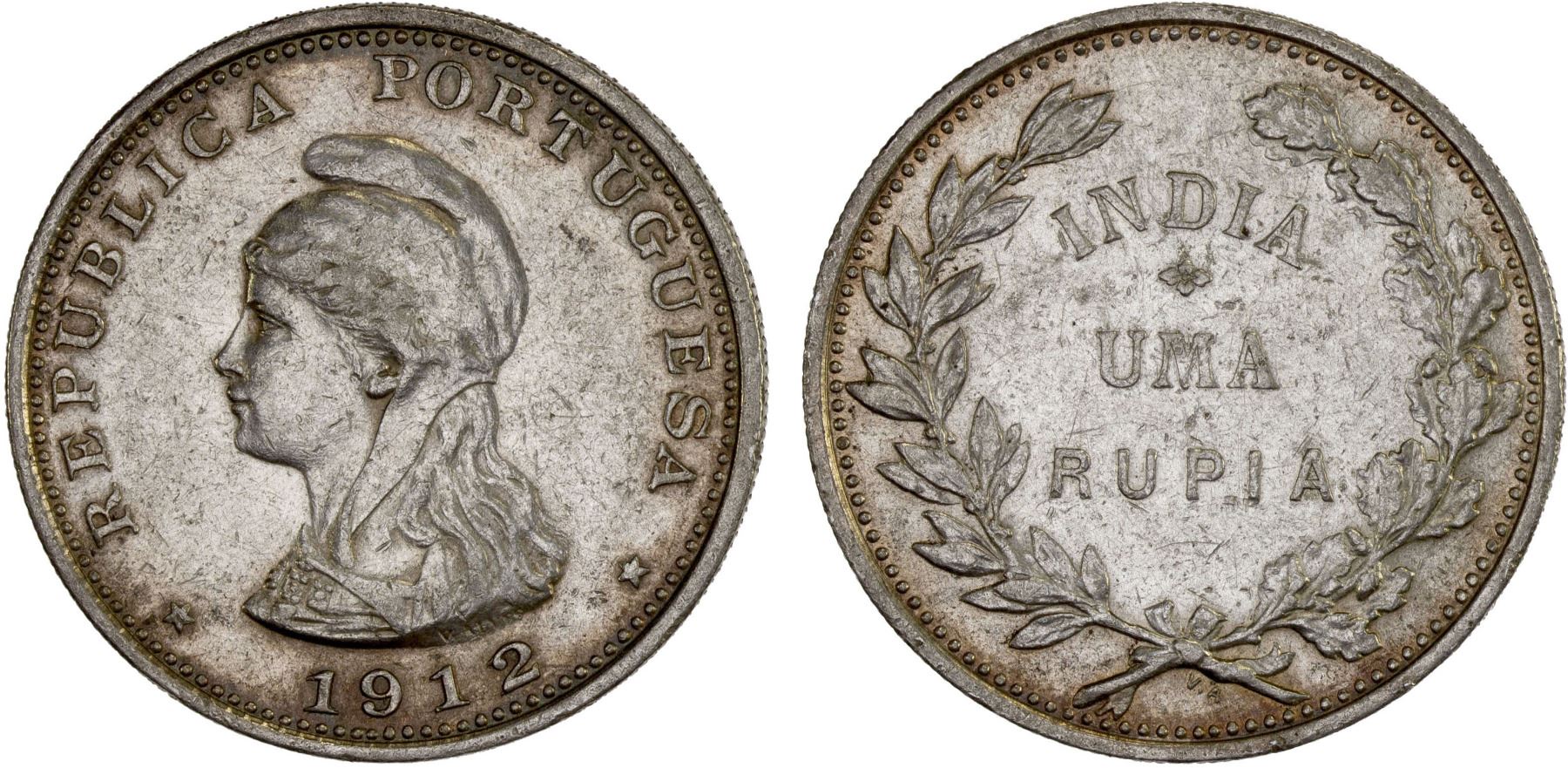 PORTUGUESE INDIA: Republic, AR rupia, 1912/1, KM-18, scarce overdate of the one-year type, lightly cleaned, XF.