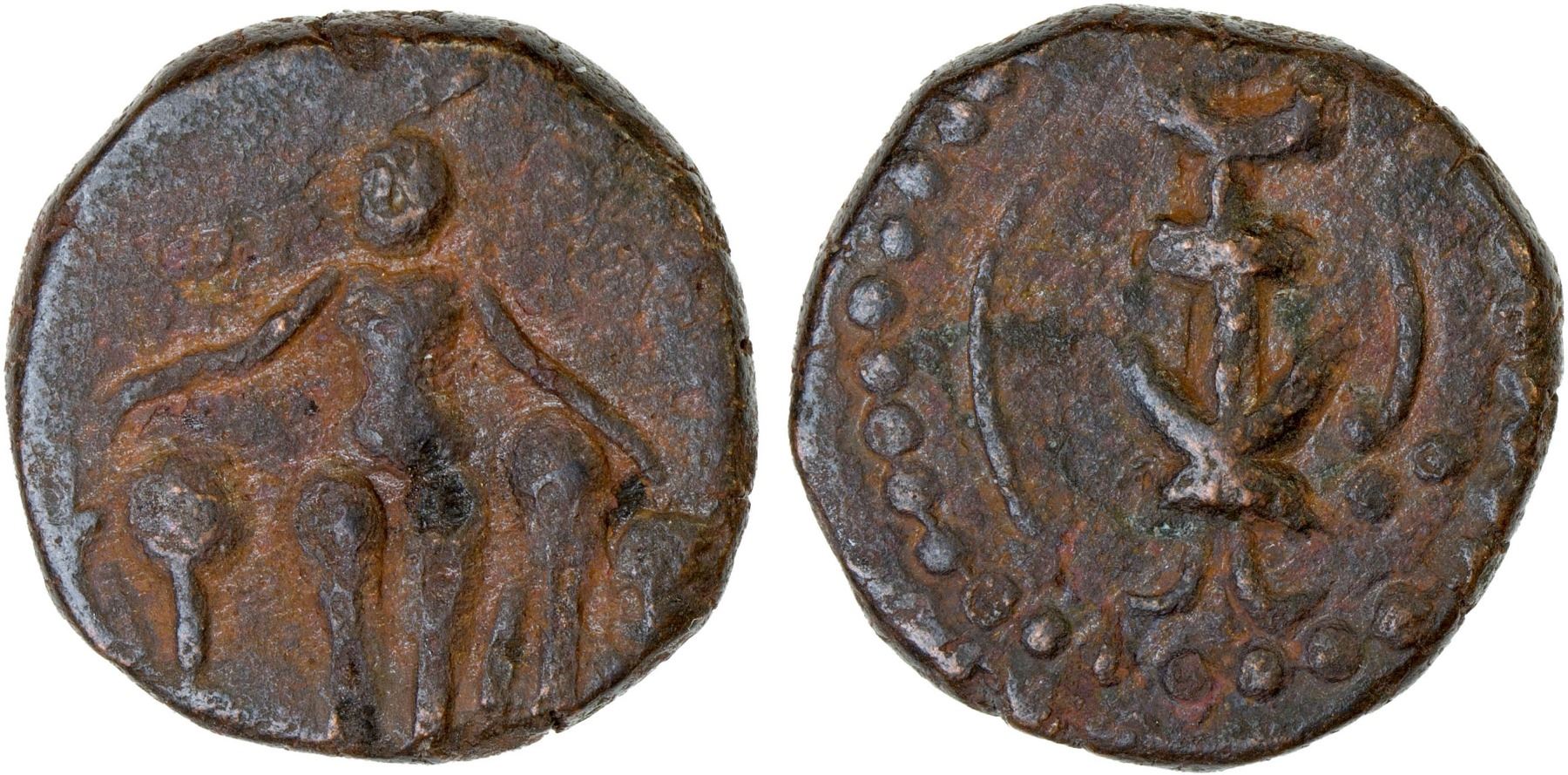 POST-KUSHAN: Kota Kula: Anonymous, ca. 360-460, AE unit (4.62g), cf. Zeno-48955, Kota symbol // stylized version of Siva standing before the bull; superb grade, VF-XF, R.