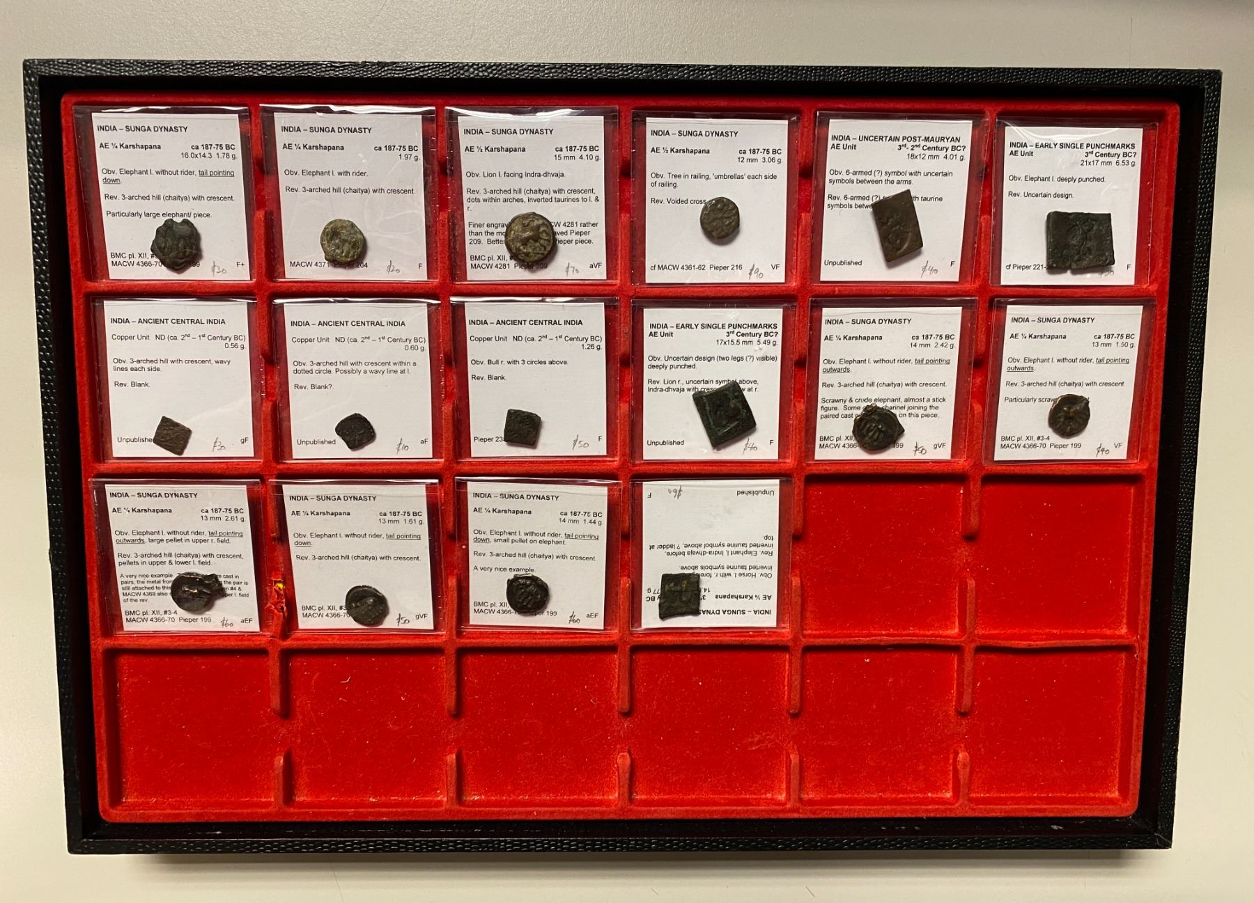 POST-MAURYAN: LOT of 10 cast copper coins, various types, including 5 examples of the elephant/hill type (Pieper-323, all in VF condition), plus 5 other types, including elephant with rider, tree, horse, and lion (averge Good ro Fine condition); all with Todd's description; retail value $350, lot of 10 pieces, ex Ian Todd Collection.