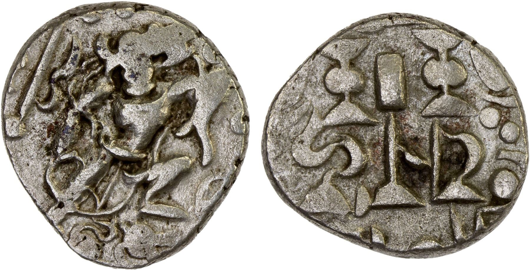 PRATIHARA: Bhoja I, 836-882, AR drachm (4.02g), De-8, Adivaraha (he boar incarnation of Vishnu) trampling lion, chakra & club right, trident & conch left // Nagari legend shrimadadi / varaha above stylized fire altar, XF.