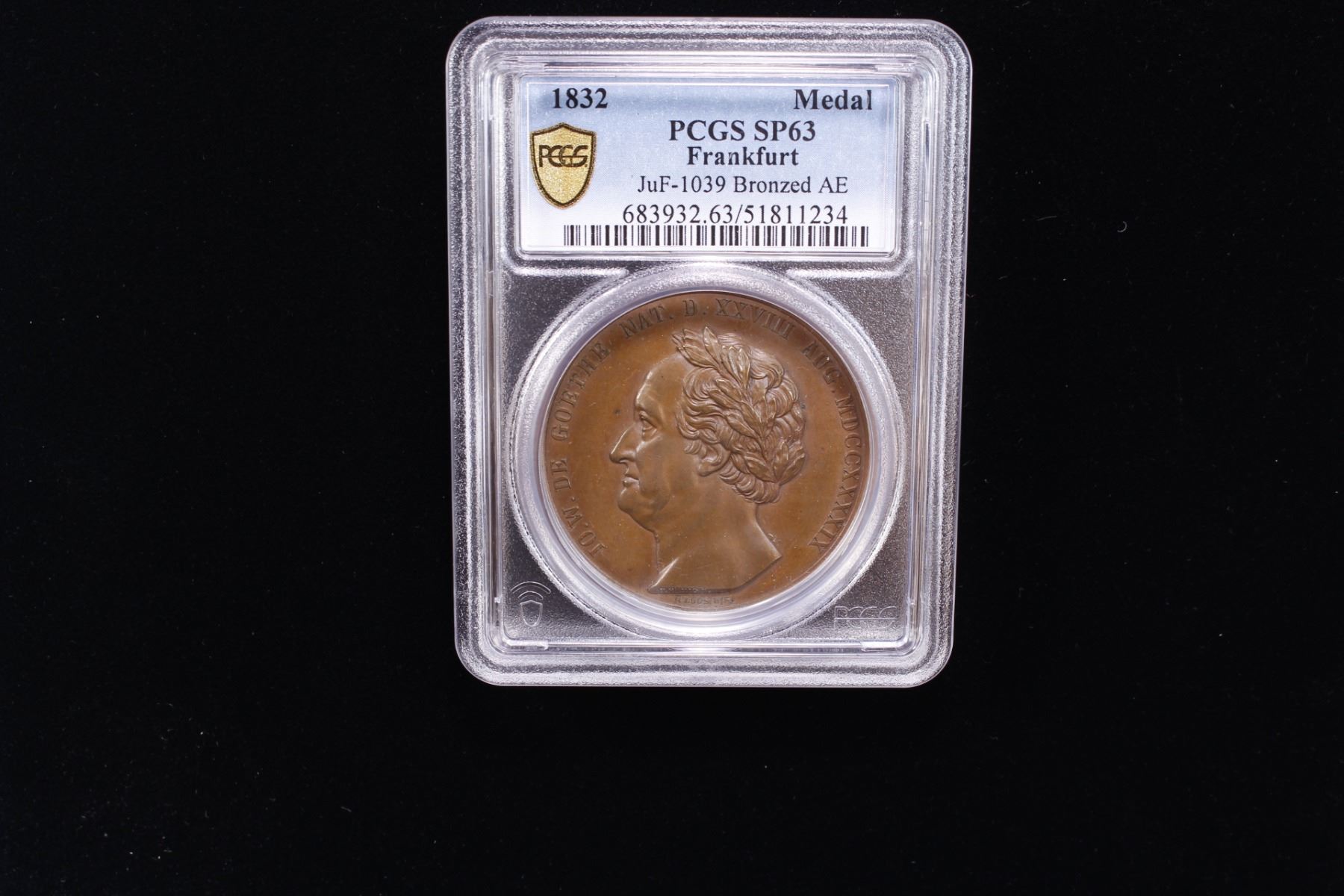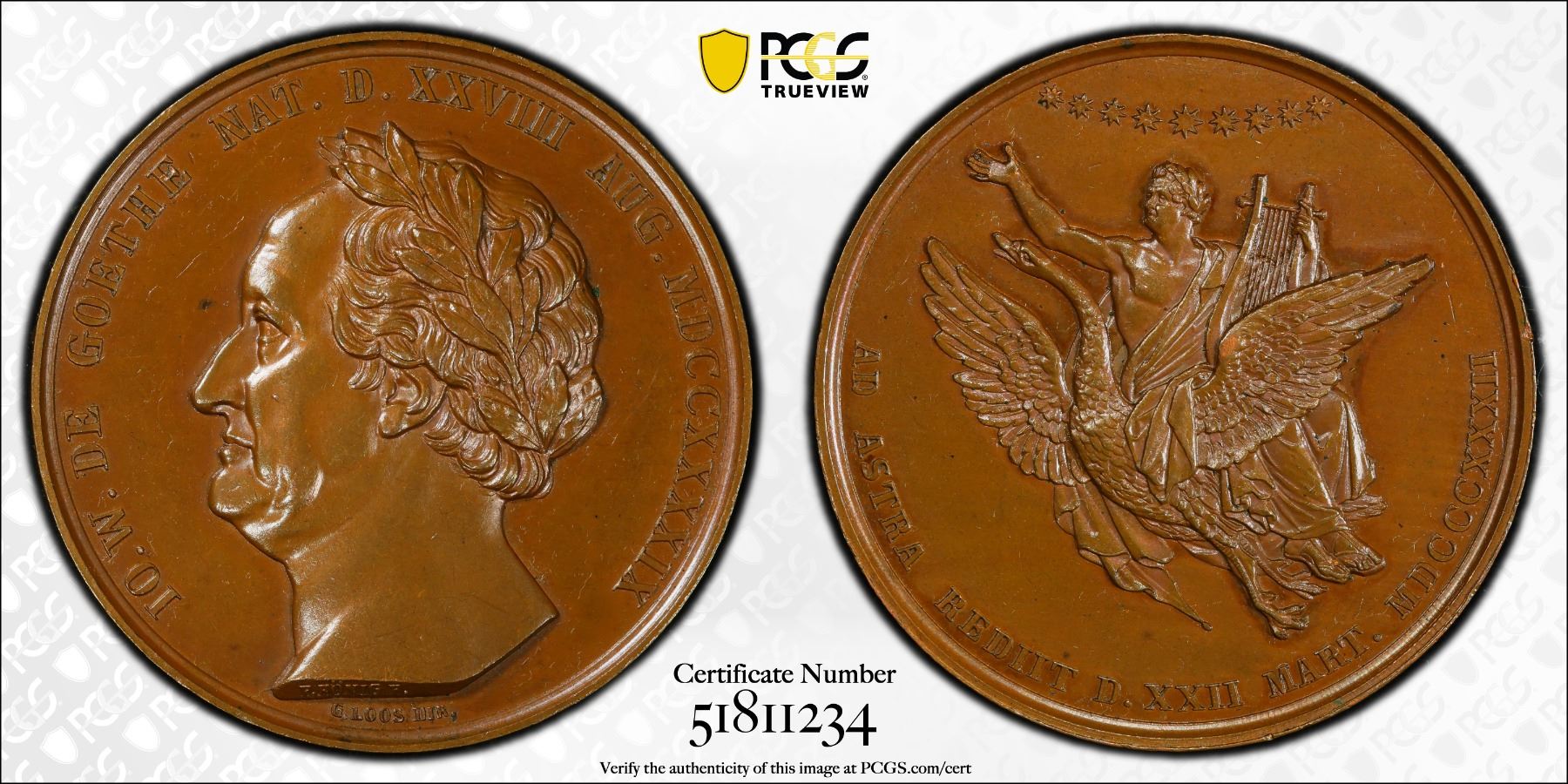 PRUSSIA: AE medal, 1832, Förschner-269, Frede-92, 42mm bronze meday by Anton Friedrich König & Loos, for the Death of Goethe; IO. w. DE GOETHE around bust of Goethe left with F. KORNIG F. on truncation, and G. LOOS DIR below // AD ASTRA REDIIT D. XII MART MDCCCXXXII around a swan raising Goethe, laureated wearing antique garb, with his lyre, to the skies, which are typified by an arch of nine stars with his chest partially bare, his right hand raised held high as he looks upwards, seated upon the back of the swan, a lovely specimen quality example! PCGS graded Specimen 63. Johann Wolfgang von Goethe(1749-1832) was a German polymath who is widely regarded as the most influential writer in the German language. His work has had a wide-ranging influence on literary, political, and philosophical thought in the Western world from the late 18th century to the present. A poet, playwright, novelist, scientist, statesman, theater-director, and critic, Goethe wrote a wide range of works, including plays, poetry and aesthetic criticism, as well as treatises on botany, anatomy, and color.