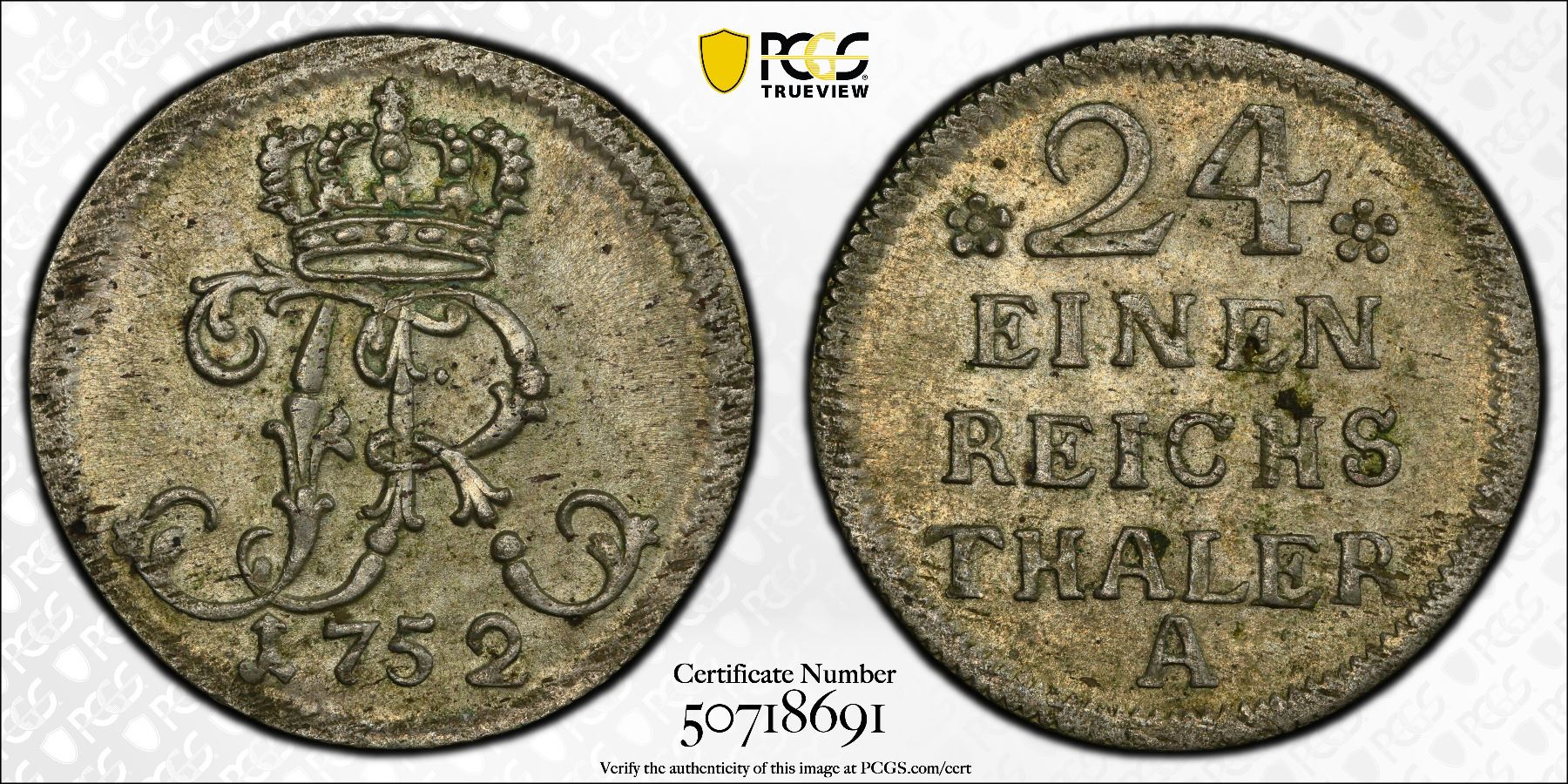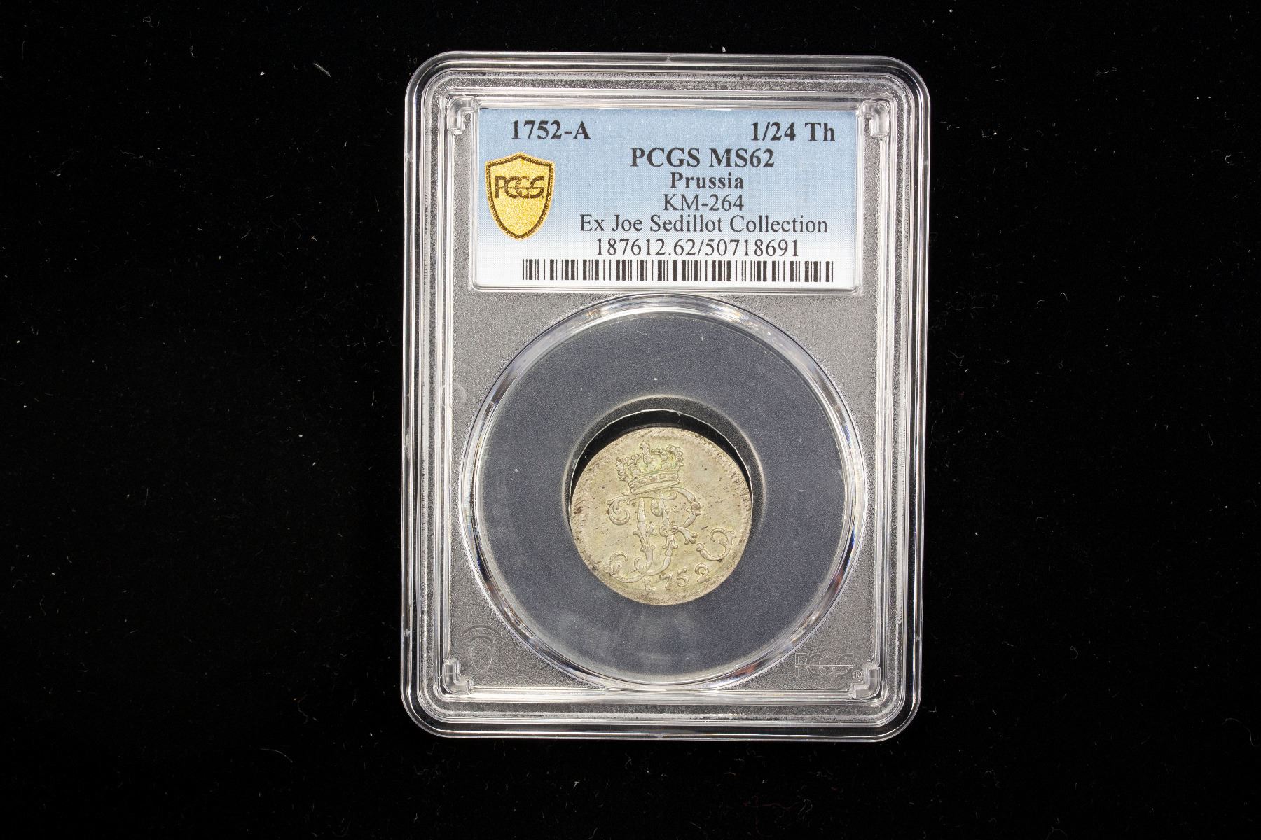 PRUSSIA: Friderich II (the Great), 1740-1786, BI 1/24 thaler, 1752-A, KM-264, a pleasing lustrous mint state example, PCGS graded MS62, ex Joe Sedillot Collection. In 1752, Prussia under Frederick the Great was at peace, specifically after the War of the Austrian Succession (1740-1748) and before the Seven Years’ War (1756-1763).