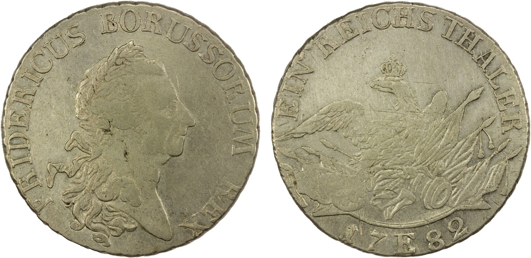 PRUSSIA: Friedrich II, 1740-1786, AR reichsthaler, Königsberg, 1782-E, KM-332, Olding-111b1, usual shallow strike, lustrous fields, AU.