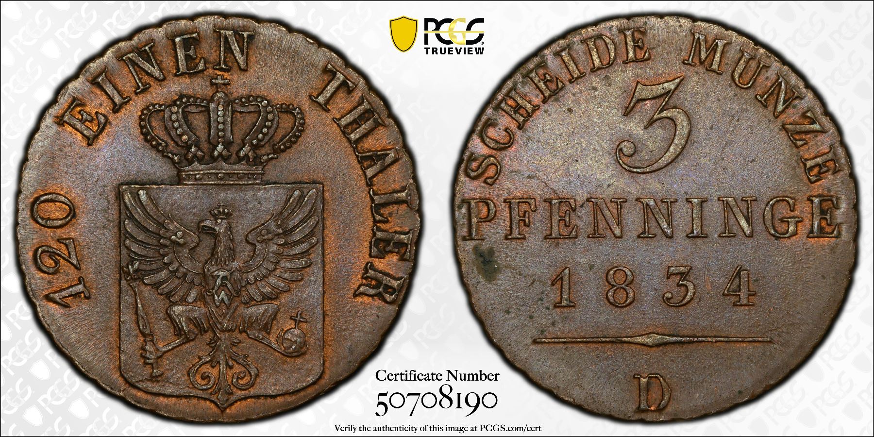 PRUSSIA: Friedrich Wilhelm III, 1797-1840, AE 3 pfennig, 1834-D, PCGS MS64 BN