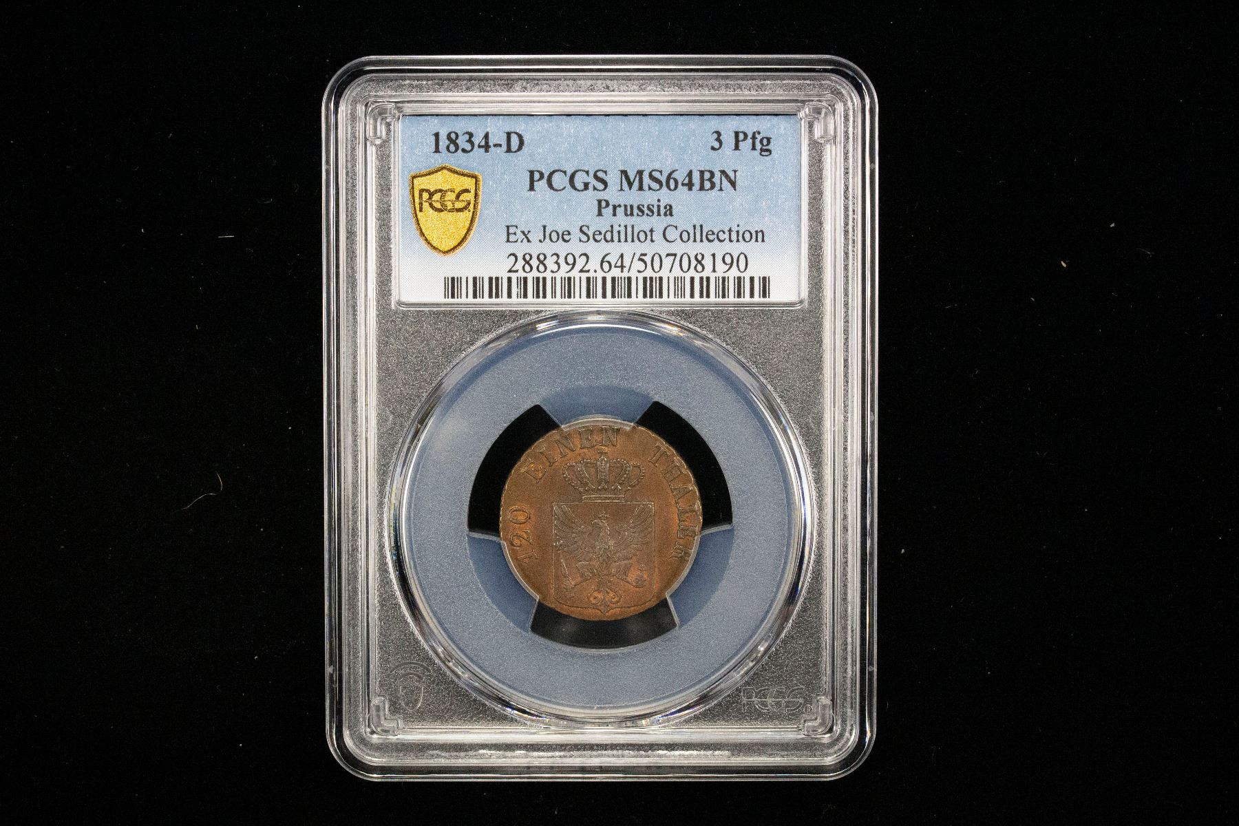 PRUSSIA: Friedrich Wilhelm III, 1797-1840, AE 3 pfennig, 1834-D, KM-407, Cr-125b, a wonderful mint state example! PCGS graded MS64 BN, ex Joe Sedillot Collection.