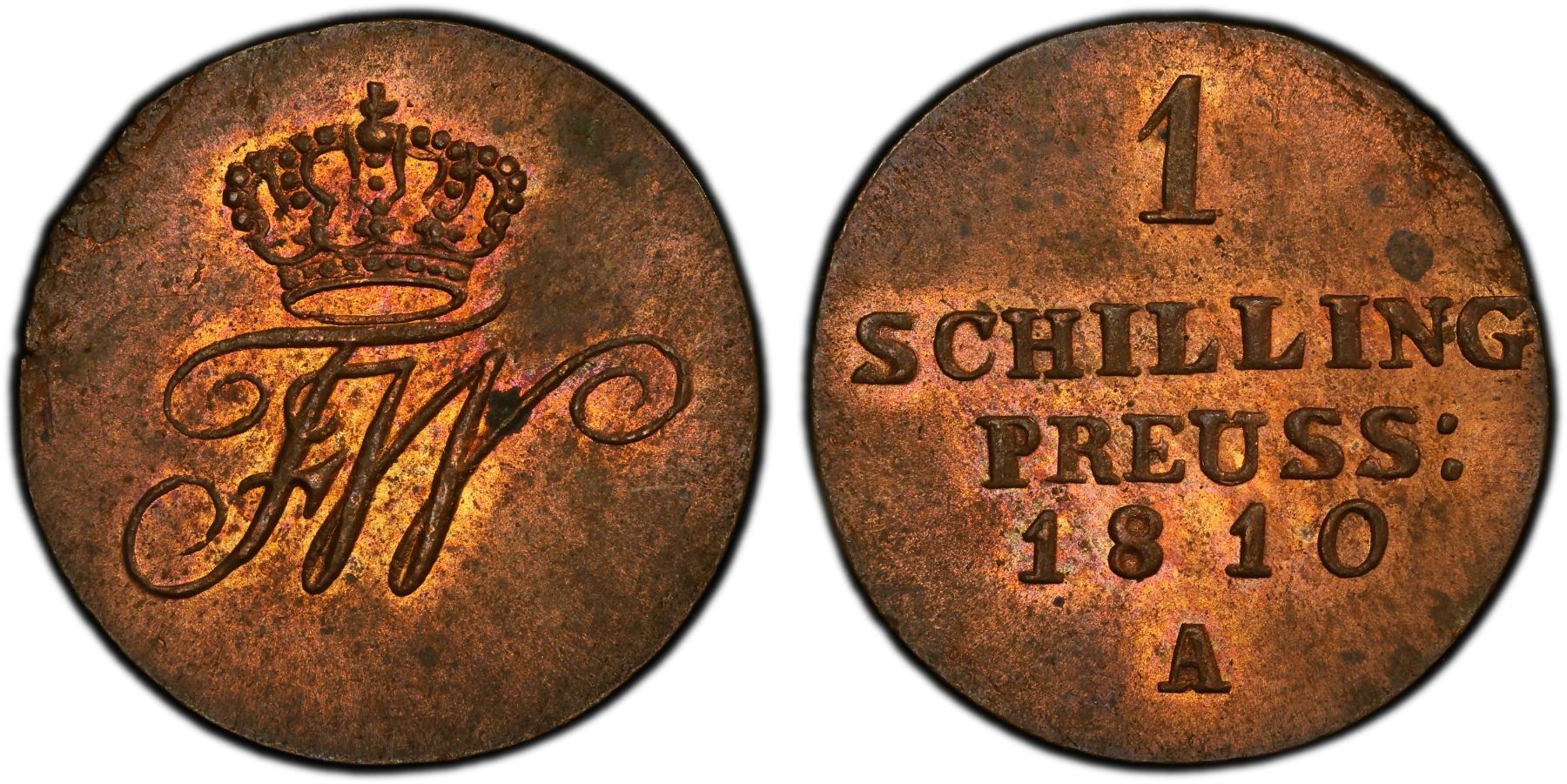 PRUSSIA: Friedrich Wilhelm III, 1797-1840, AE schilling, 1810-A, PCGS MS64 RB