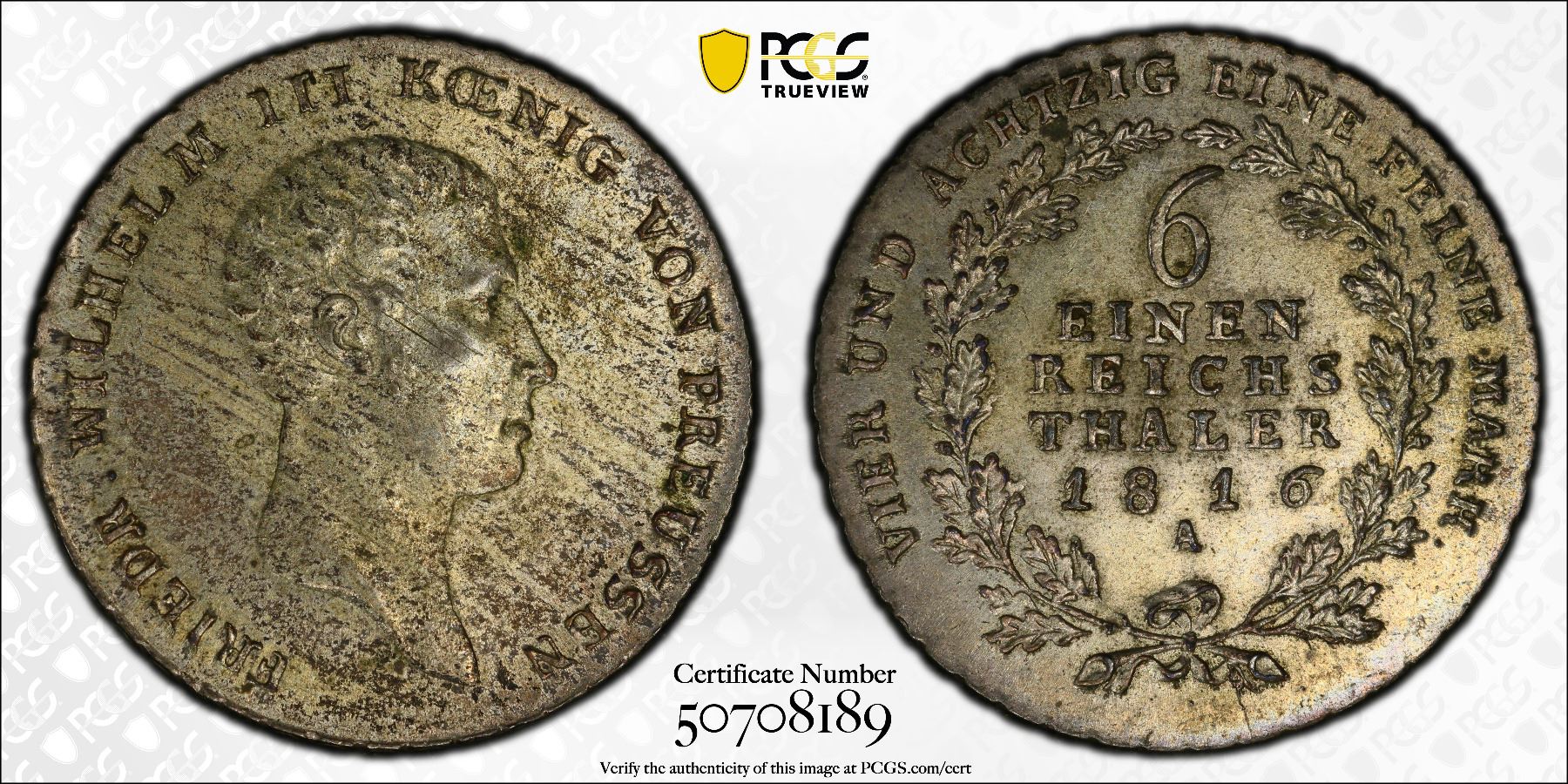 PRUSSIA: Friedrich Wilhelm III, 1797-1840, AR 1/6 thaler, 1816-A, PCGS MS63