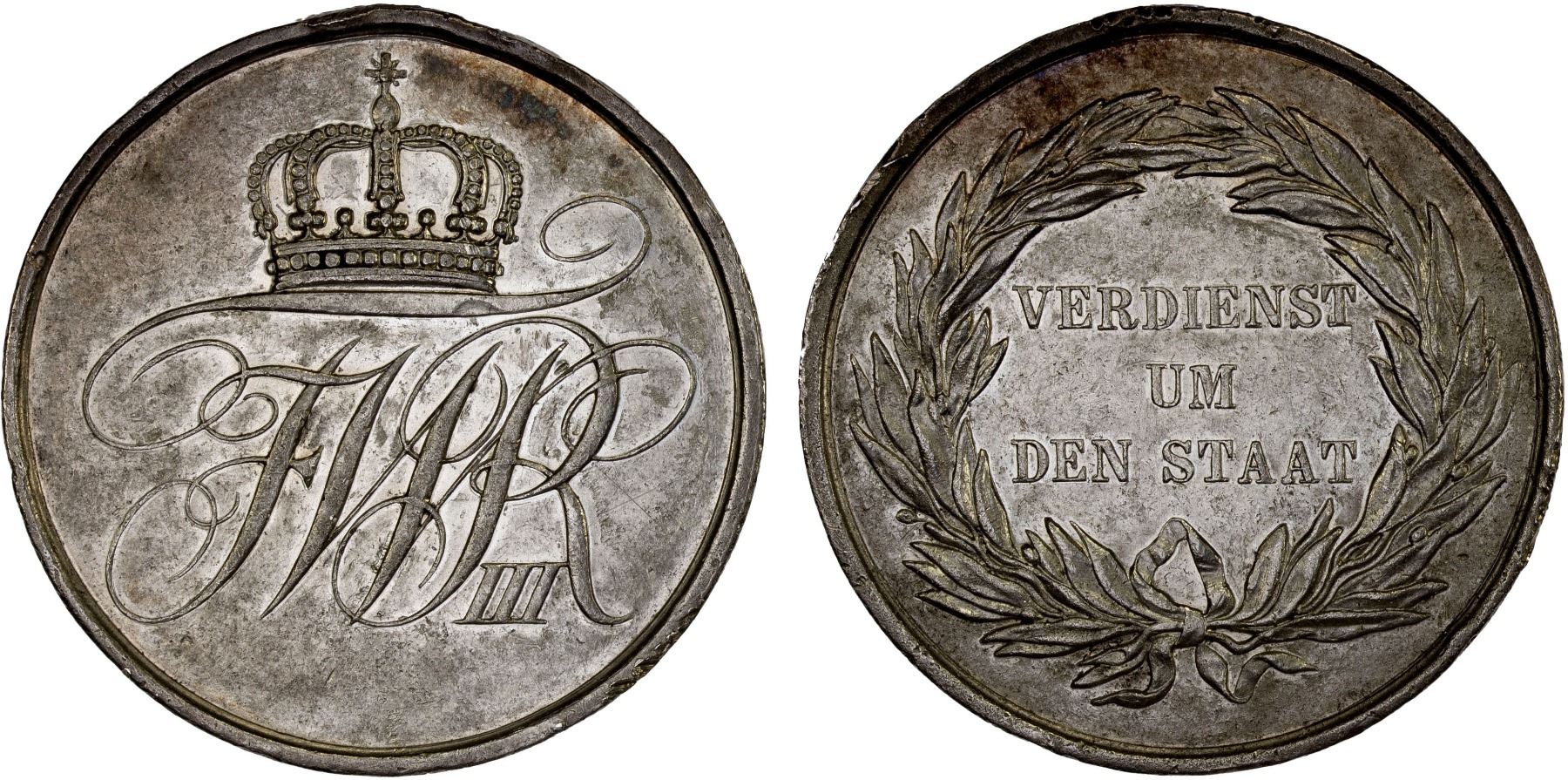 PRUSSIA: Friedrich Wilhelm III, 1797-1840, AR medal (21.85g), 39 mm, for merit to the state, crowned monogram / VERDIENST UM DEN STAAT in laurel wreath, loop removed, XF.