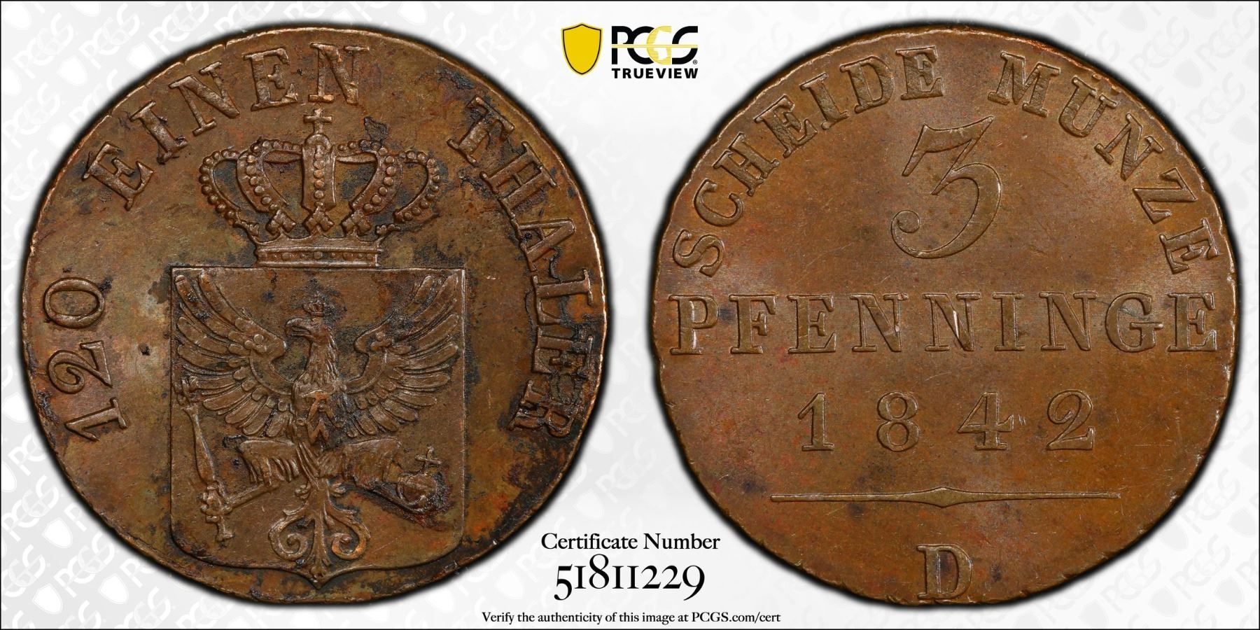 PRUSSIA: Friedrich Wilhelm IV, 1840-1861, AE 3 pfennig, Düsseldorf, 1842-D, PCGS MS61 BN