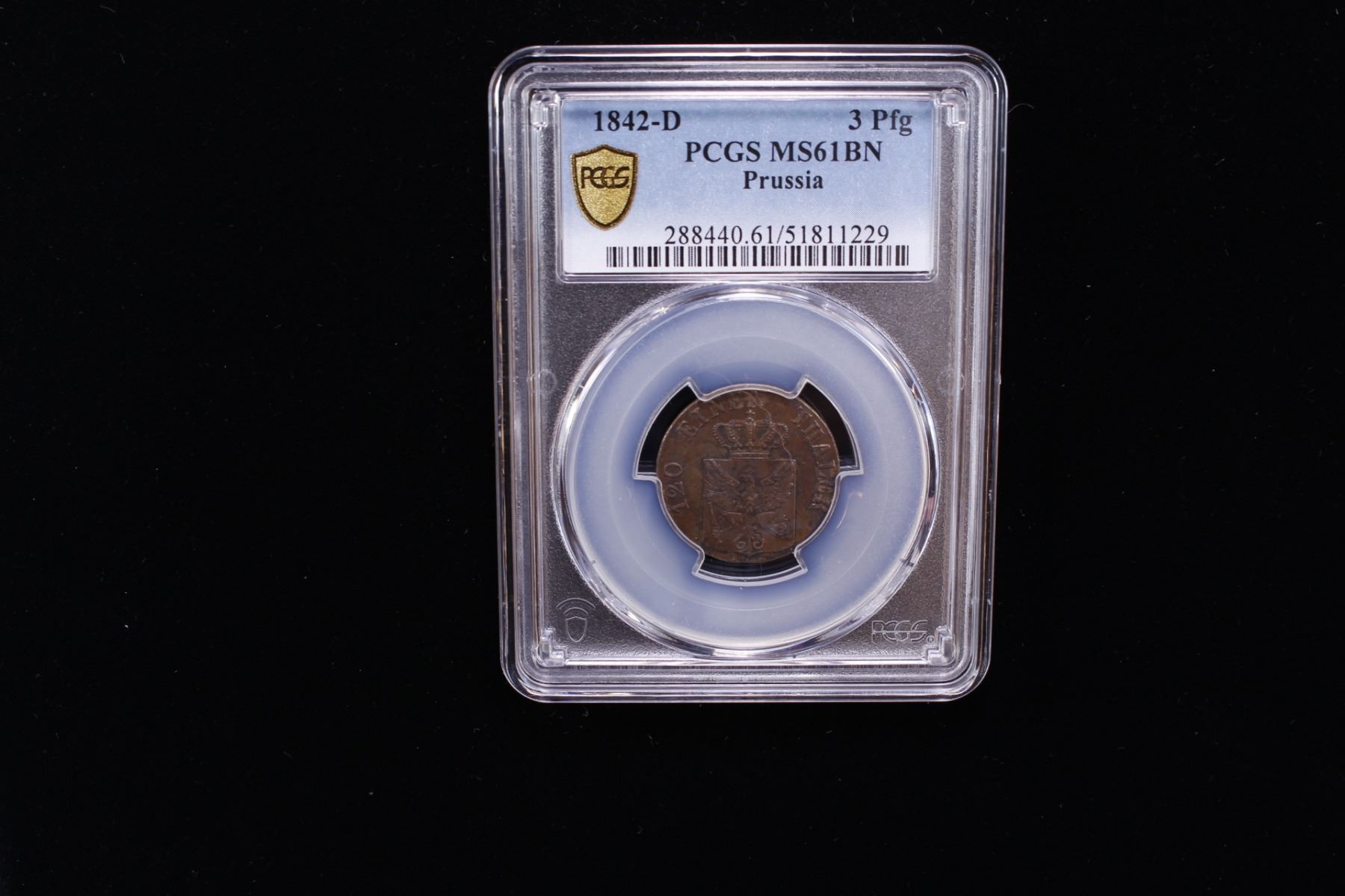 PRUSSIA: Friedrich Wilhelm IV, 1840-1861, AE 3 pfennig, Düsseldorf, 1842-D, KM-432, a pleasing example, PCGS graded MS61 BN.