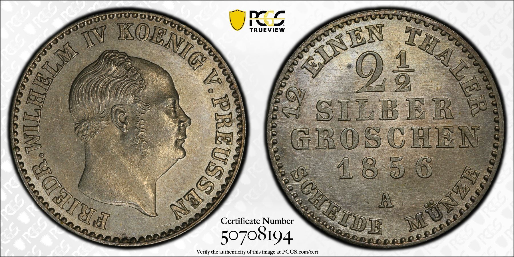 PRUSSIA: Friedrich Wilhelm IV, 1840-1861, AR 2½ groschen, 1856-A, PCGS MS65