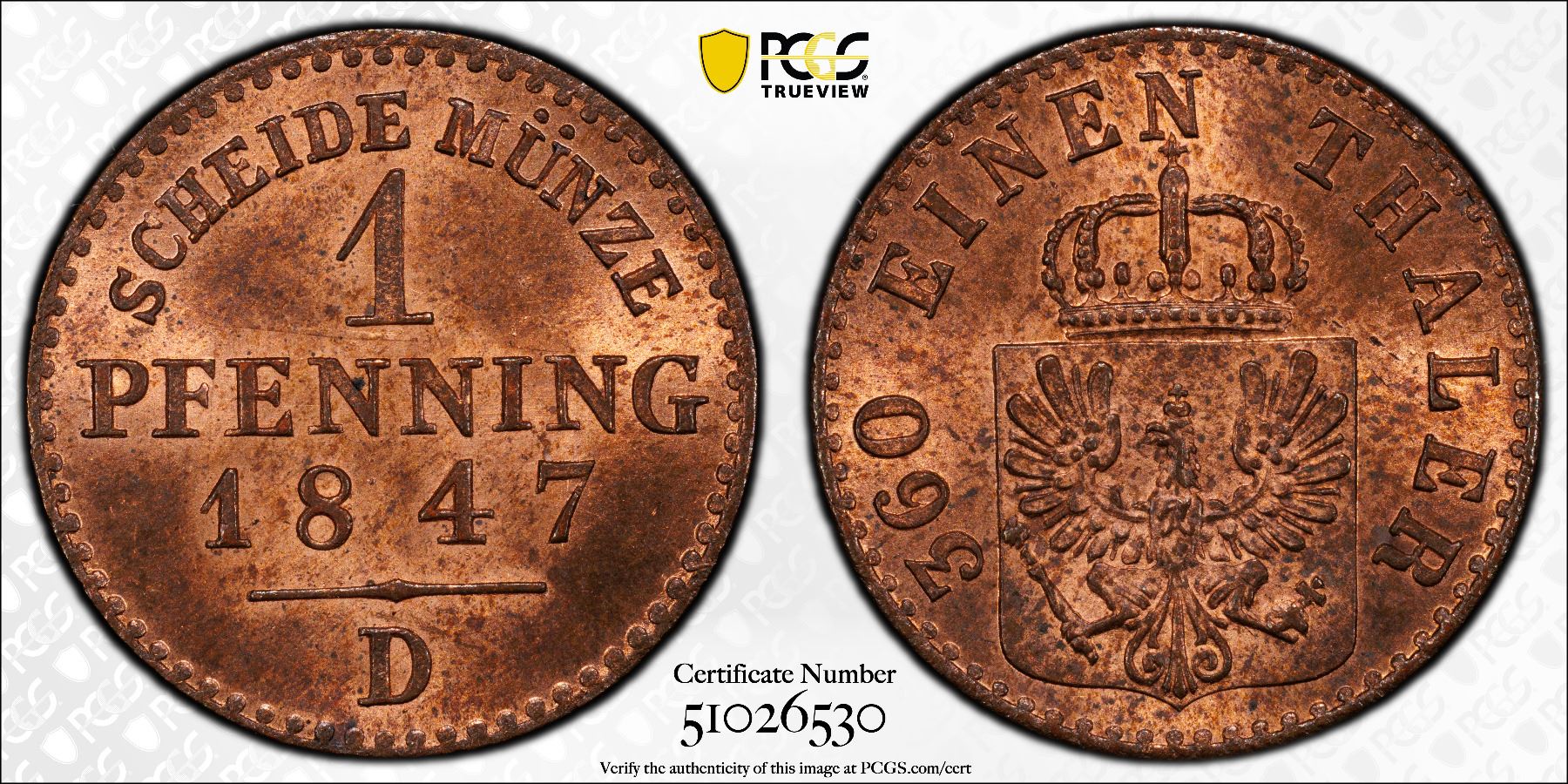 PRUSSIA: Friedrich Wilhelm IV, 1840-1861, AR pfennig, 1847-D, KM-451, a wonderful mint state example! PCGS graded MS64 RB.
