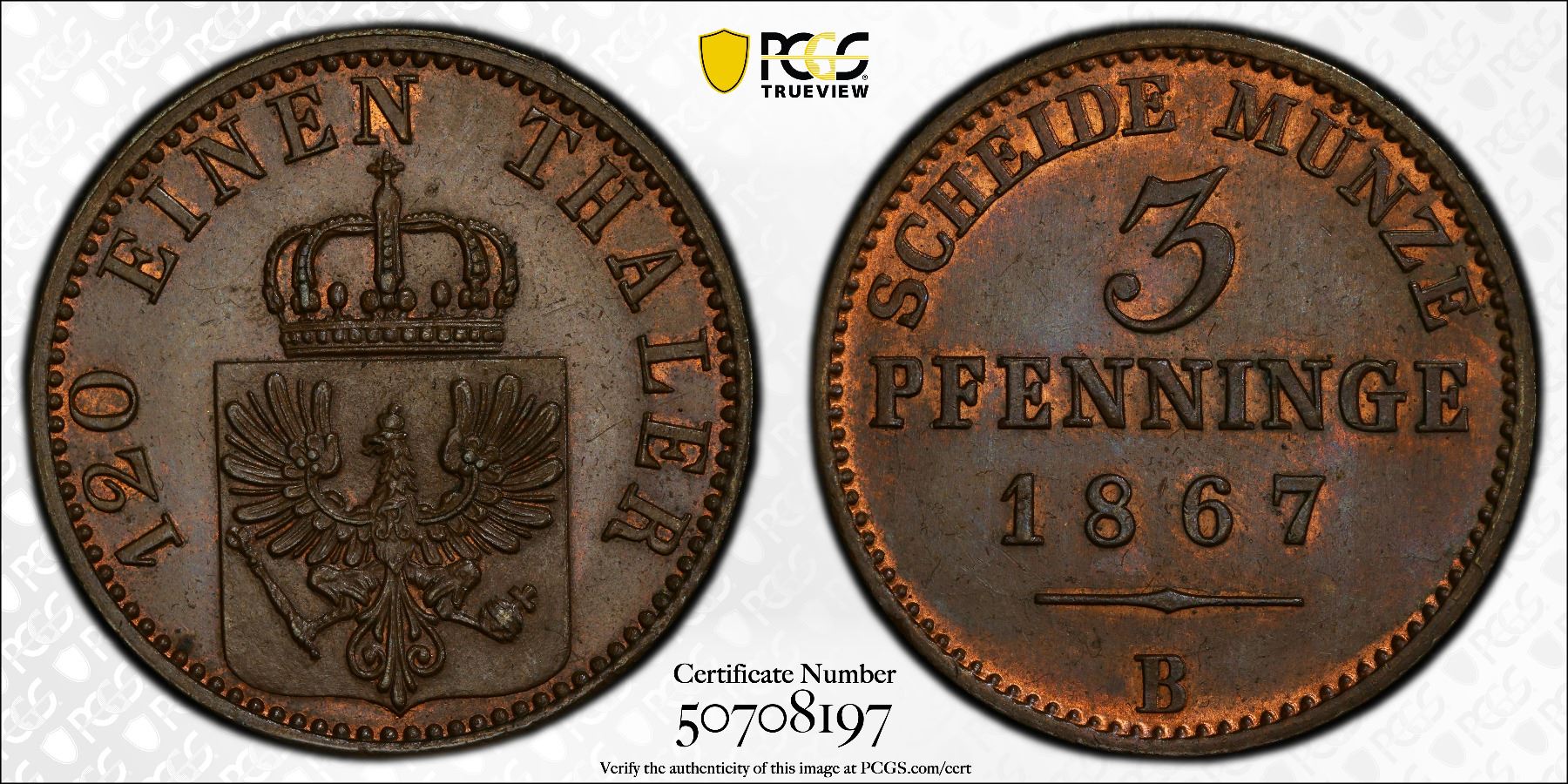 PRUSSIA: Wilhelm I, 1861-1888, AE 3 pfennig, 1867-B, PCGS MS65 BN