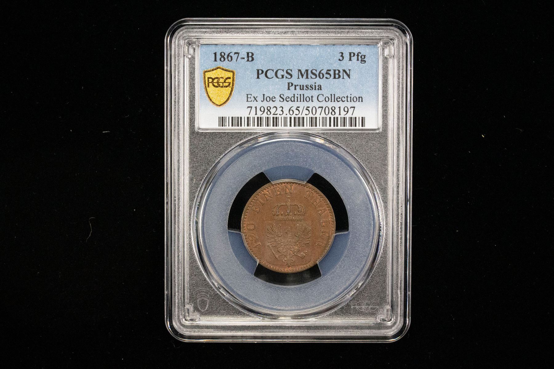 PRUSSIA: Wilhelm I, 1861-1888, AE 3 pfennig, 1867-B, KM-482, Cr-163a, a superb mint state example! PCGS graded MS65 BN, ex Joe Sedillot Collection.