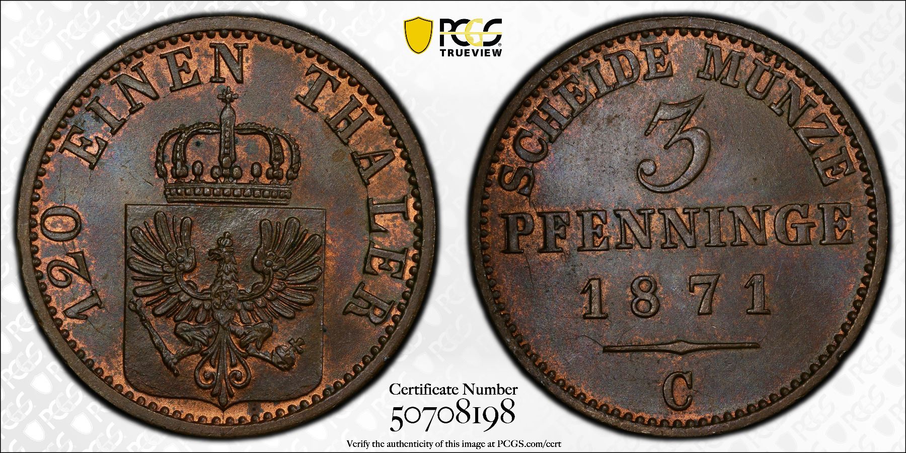 PRUSSIA: Wilhelm I, 1861-1888, AE 3 pfennig, 1871-C, PCGS MS65 BN