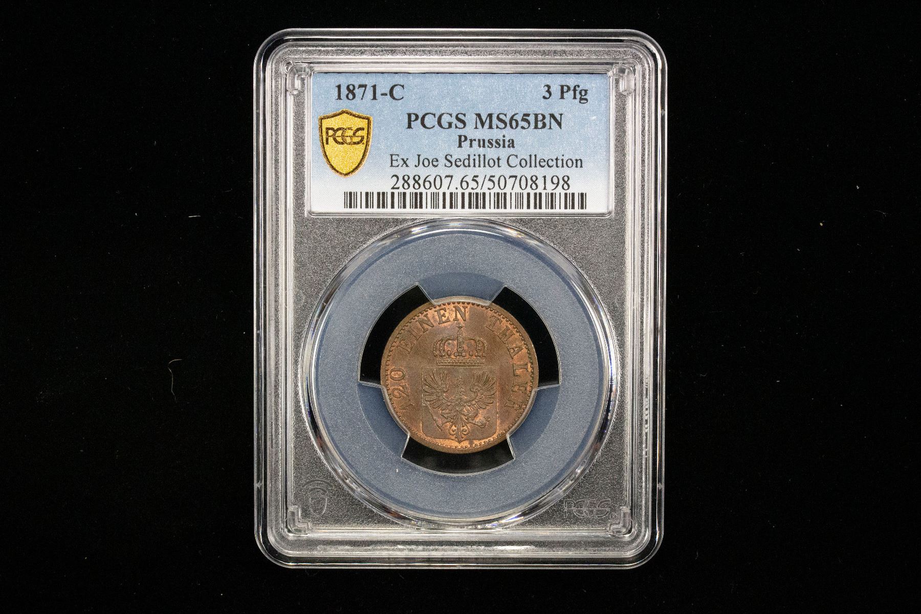 PRUSSIA: Wilhelm I, 1861-1888, AE 3 pfennig, 1871-C, KM-482, Cr-163b, a superb mint state example! PCGS graded MS65 BN, ex Joe Sedillot Collection.