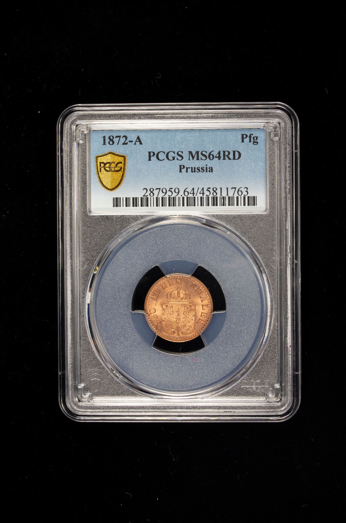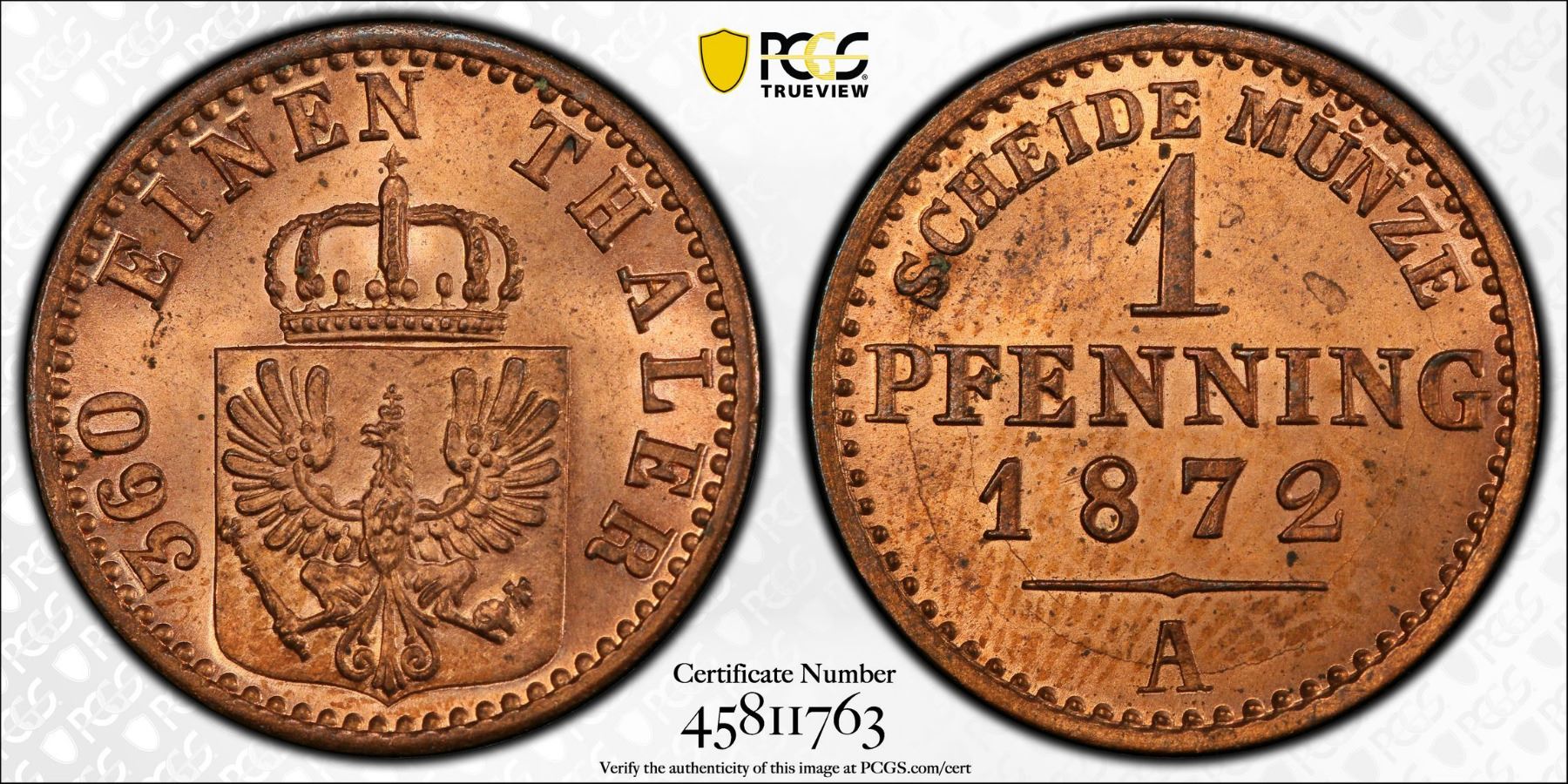 PRUSSIA: Wilhelm I, 1861-1888, AE pfennig, 1872-A, PCGS MS64 RD