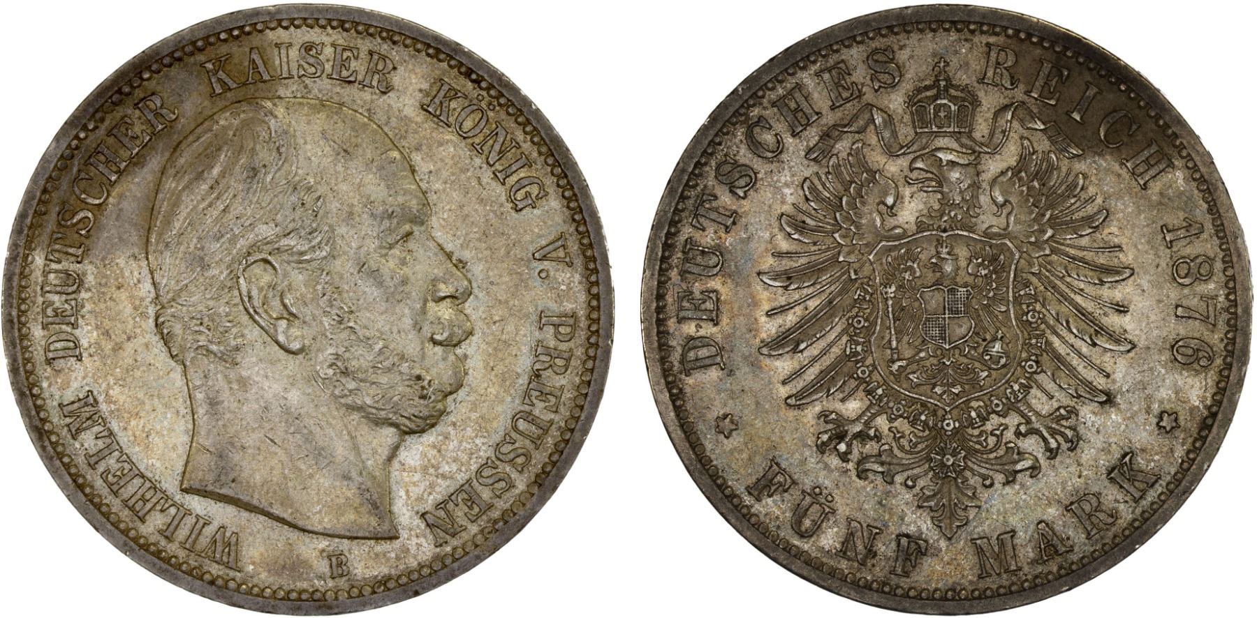 PRUSSIA: Wilhelm I, 1861-1888, AR 5 mark, 1876-B, KM-503, J-97, light stain, still a much better than average quality example, XF-AU.