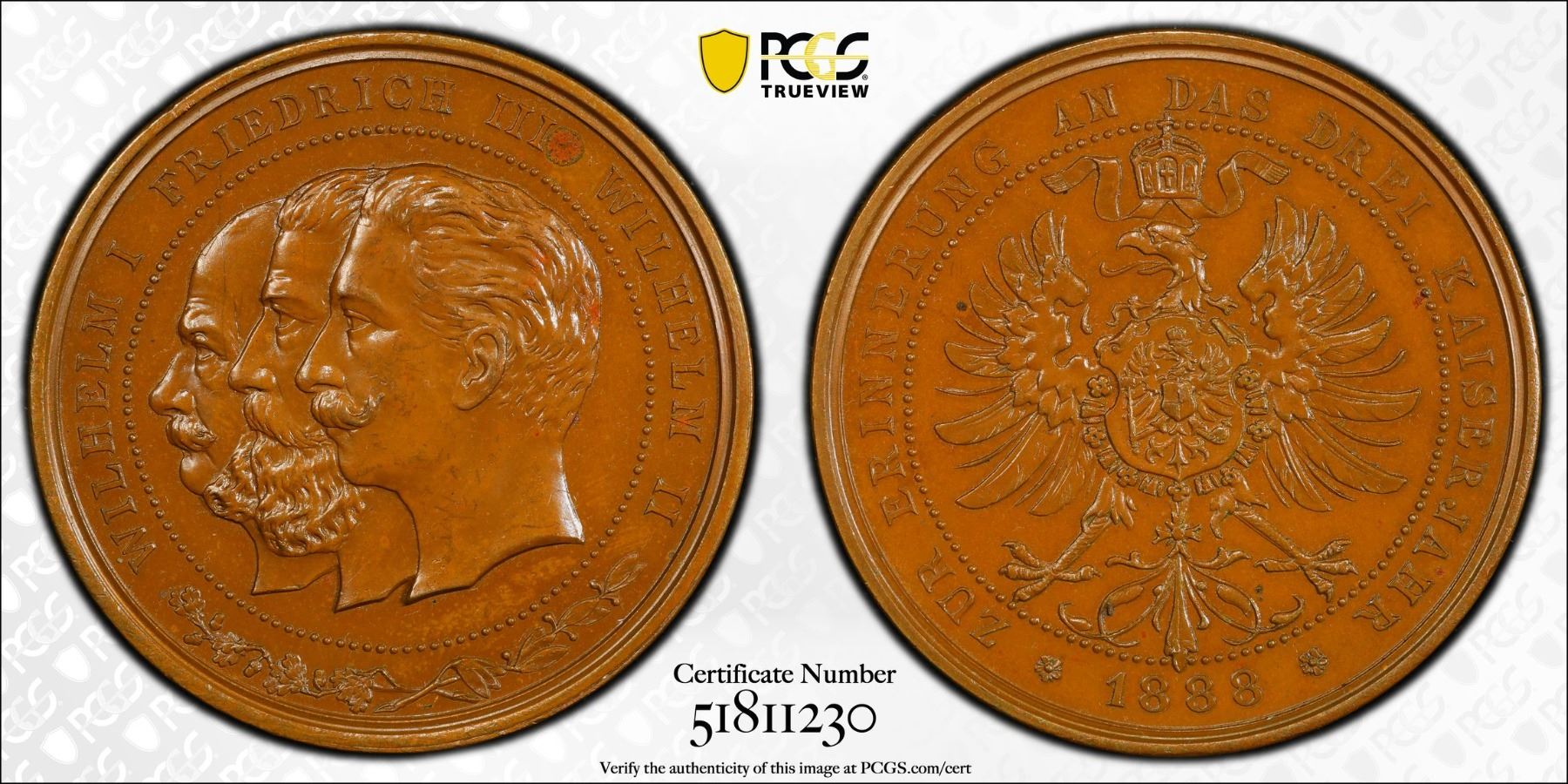 PRUSSIA: Wilhelm II, 1888-1918, AE medal, 1888, Marienburg-6820, 34mm bronze medal by J, DIller for the Year of Three Emperors - Wilhelm I, Friedrich III, Wilhelm II, a wonderful example, PCGS graded Specimen 64.